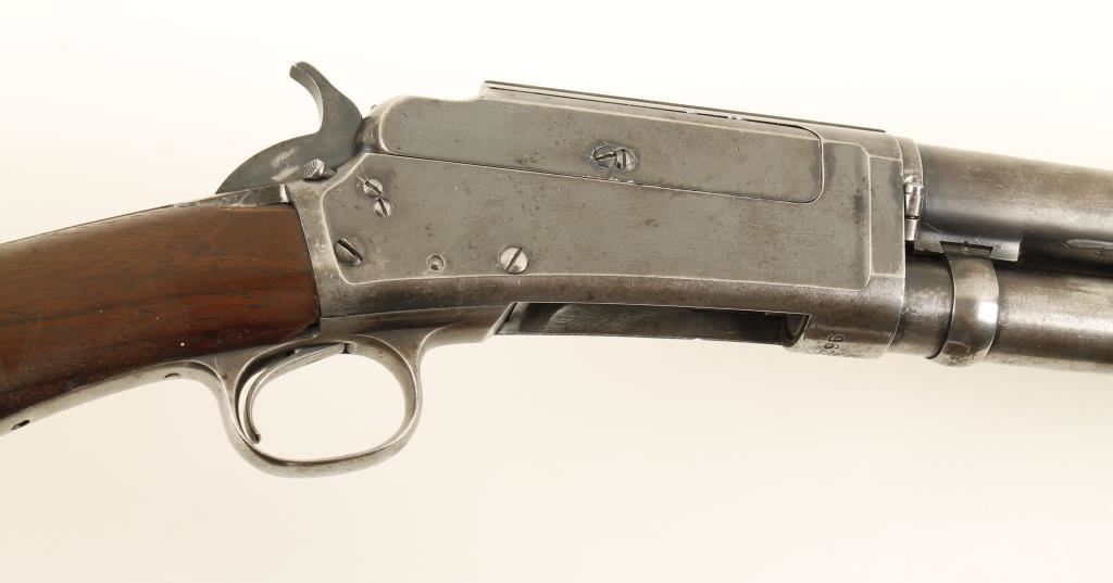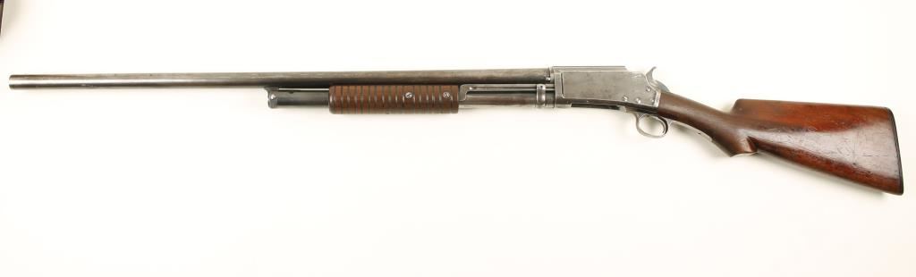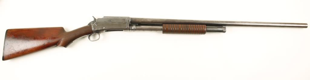 Blued pump-action exposed hammer shotgun with 30" barrel and wood stocks. Bluing on the barrel and mag tube has faded to a grey/brown patina. The high polish receiver retains more bluing but it is scratched with fading and some small pitted areas. Someone scratched their SS# in the side of the receiver. Some of the screw heads are slightly buggered. Action is good. The butt stock is missing chips at the corners of the upper tang and a sliver is gone from the side of the lower tang. The buttplate is a Marlin plastic item but doesn't appear to be original. The stock has wear and many dings, scratches and dents. The forend has dings and a crack running forward from the slide arm. Condition is fair. *Modern Firearm*