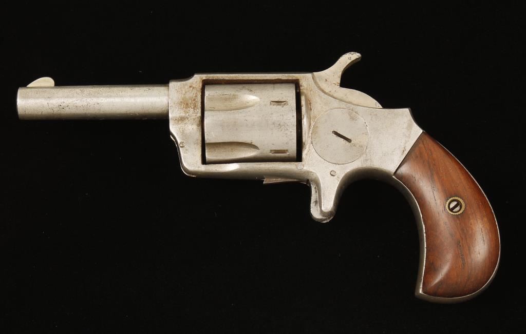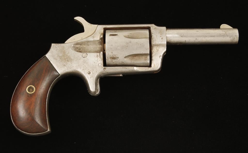 Once nickel plated single-action spur trigger 5-shot rimfire revolver with a 2-5/8" barrel and wood grips. Cylinder pin and pin release are broken. Very small amounts of the plating remain. Now bare metal with pin-prick pitting and scratches. Bore is dull with rifling and pitting. Chambers are dull and dirty with pitting and what may be rust. The hammer cocks but the cylinder doesn't rotate or index. Grips have no finish, are tight and have few dings and scratches. Condition is poor. *Antique Firearm*