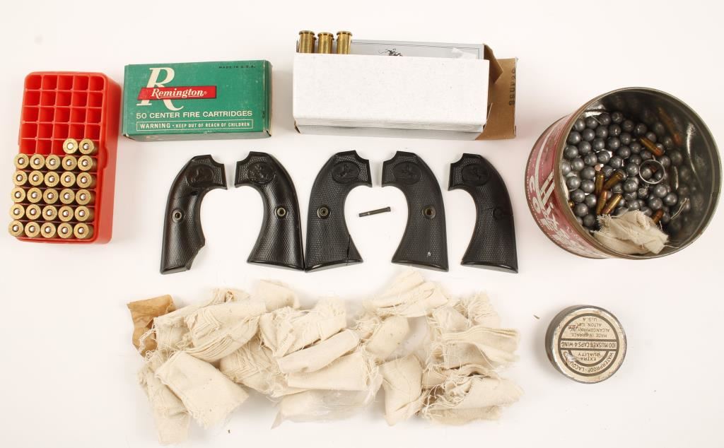 Assortment of ammo including: 26 rounds of .45 Colt, 50 rounds of .32 Short Colt 80 grain lead bullet, 6 rounds of .25-35 Winchester Super X 117 grain soft points, lead balls, patches and caps. Included are five Bisley grips, two sets and a single and only 2 grips without a crack or chip.