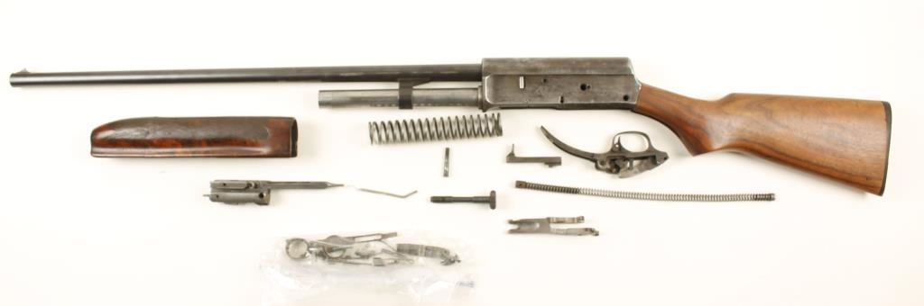 Blued and roll-stamped long recoil semi-automatic licensed copy of John Brownings Auto 5 made for the U.S. market. Bluing on the 28" barrel is good with a few small rubs through the finish. The receiver is a mottled dull grey with bare metal areas and some light pitting. The magazine tube is bare metal. Bore is bright with wear marks. This shotgun may not be complete as it is disassembled with the action parts and forend in an attached bag. Butt stock looks like it is a replacement and it is in great shape. Condition is fair. *Modern Firearm*