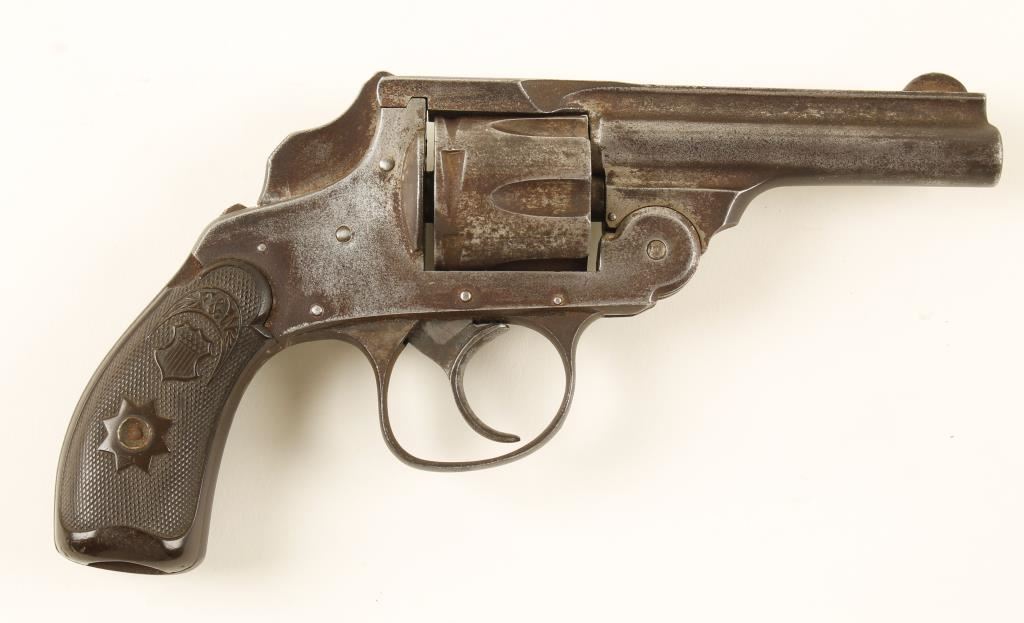 Nickel plated 6-shot top-break double-action revolver with a 3-1/4" barrel and checkered hard rubber grips. Plating remains only in protected areas with the worn areas turning to a brown patina with pin prick pitting. The bore is dull with sharp rifling and lots of pitting. Chambers are also dull with pitting. Action doesn't work. The cylinder will rotate but the hammer doesn't rise or fall. The left grip has a crack on the bottom around the locating pin hole and the right grip has pieces missing on the bottom and the top rear near the knuckle of the grip. Condition is poor. *Modern Firearm*