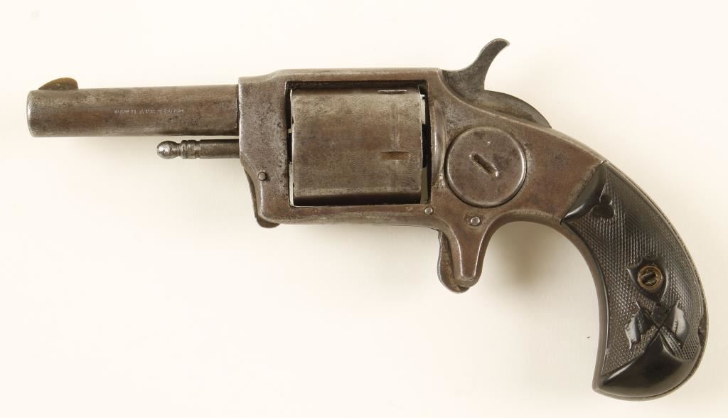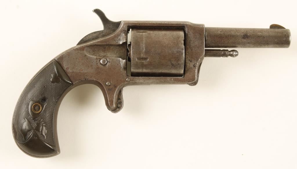 Bare grey metal 5-shot single-action rimfire spur triggered revolver with a 2-1/2" barrel and checkered hard rubber grips. Metal finish is bare metal with pin prick pitting and evidence of light surface rust. Bore is dark with rifling and pitting, chambers are the same. Both grips are worn and missing chips from the locating pin in the backstrap. Condition is fair to good. *Antique Firearm*