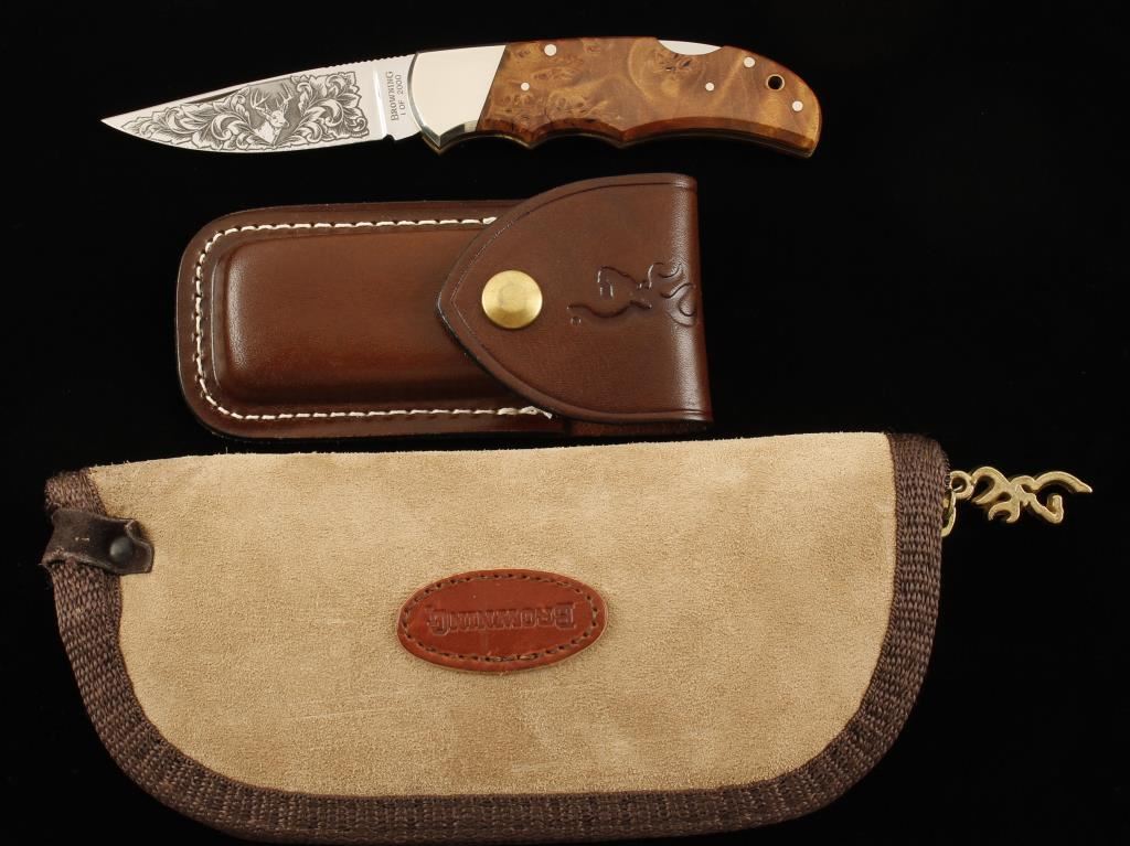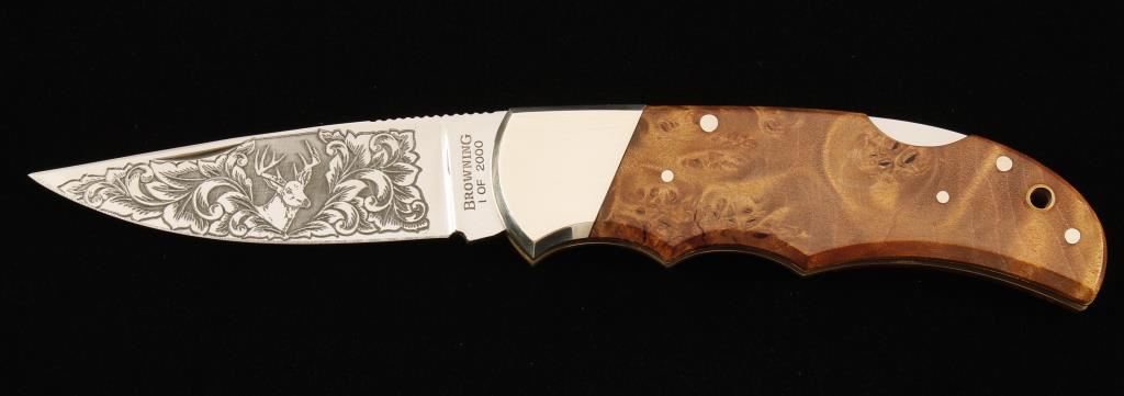 Limited Edition 1/2000 with engraved blade with buck and scroll engraving. Model 108. Burled wood handle. Comes with Browning brown leather belt carrying case and suede Browning storage case. Mint condition.