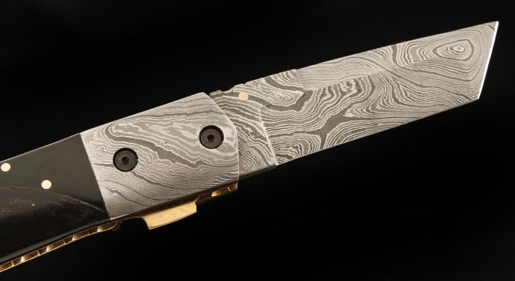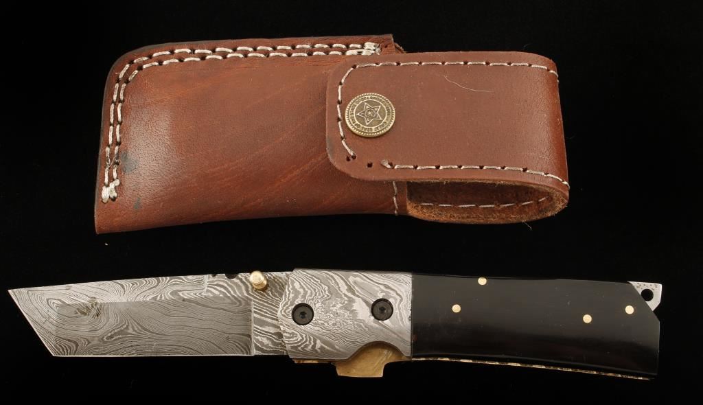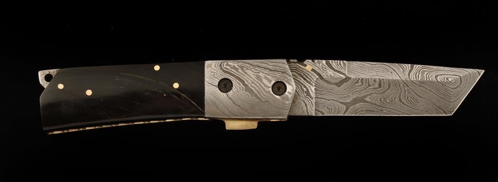8" with a black bull horn handle. Super cool/sharp Tanto blade is 3.5" and the handle is 4.5". Easy to use one-handed function. Comes with handmade genuine leather sheath. Custom made by Kevin Johnson.