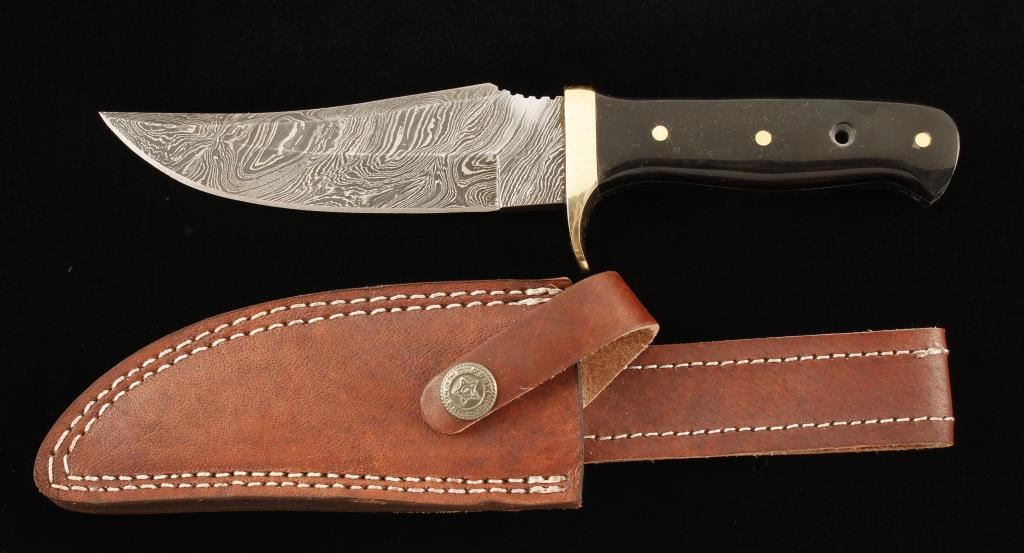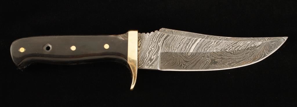 9" with a black bull horn and brass handle. Upswept blade is 5" and the handle is 4". Comes with handmade genuine leather sheath. Custom made by Kevin Johnson.