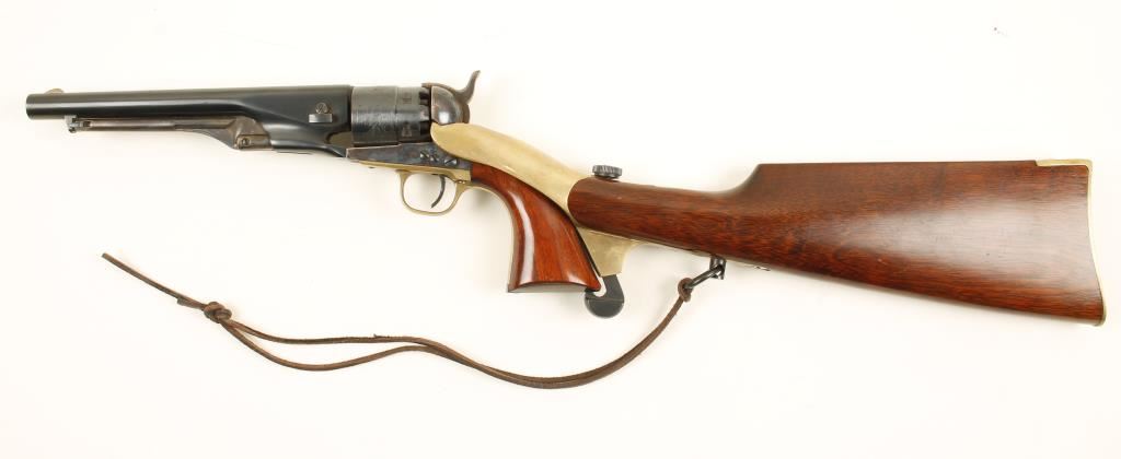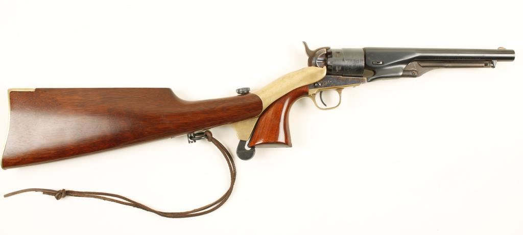 Replica blued and case colored black-powder percussion single-action 6-shot revolver with a 8" barrel and a shoulder stock. Bluing is good, cylinder has a roll-stamped naval engagement scene. The case-hardened frame has bright colors. Gun has a good amount of surface rust. The brass front strap has tiny scratches. Wood has a few scratches and dings. Bore is rusty and pitted. Action is frozen. Condition is fair. *Antique Firearm*