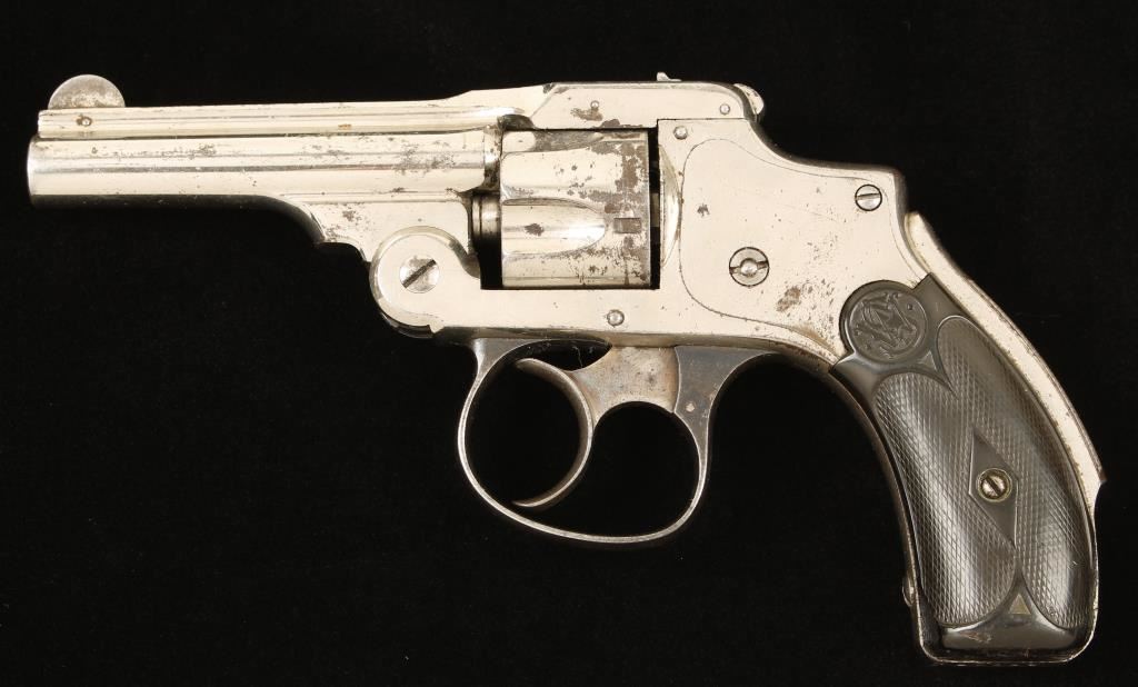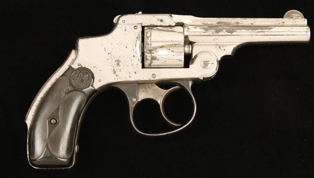 Nickel plated 1st model double-action only 5-shot top break revolver with a 3" barrel. Nickel finish is dull with flaking and scratches. Color case hardened trigger still has some pale color to it. The trigger guard is blued and has gone dull. The hard rubber grips are worn smooth in spots and have a chip out of one and abrasions on the bottom. Function is smooth with good lock-up. The bore is dull with some pitting but has strong rifling. Chambers are in good condition. "Modern Firearm"