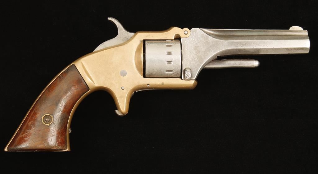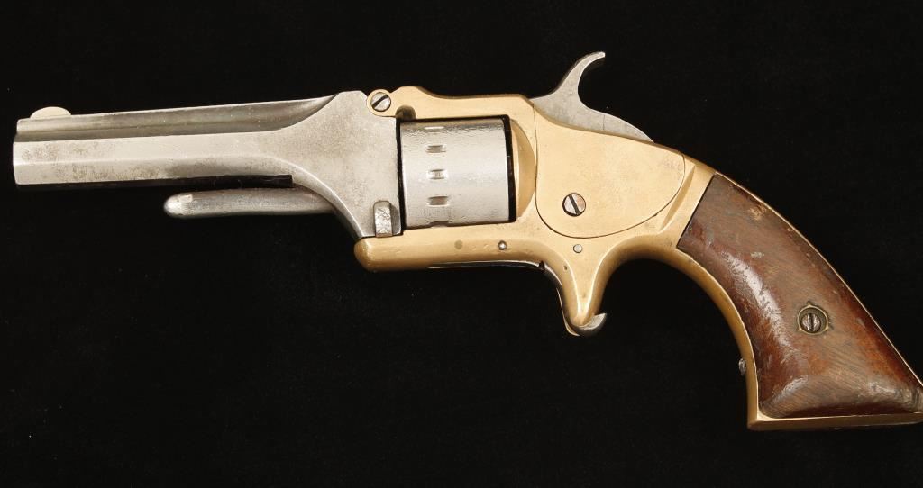 Plated brass and blued steel single-action spur trigger 7-shot revolver with a 3-1/8" octagon tip-up barrel and wood grips. Bluing has gone to bare metal with pitting. The ejection rod is bent. The brass fame has a vestige of the plating in the recoil shield/frame juncture and has some dings and pitting. Bore is dull with sharp rifling and pitting. Chambers are all dull with pitting. Barrel hinge is loose. Sideplate screw may be a replacement. Action doesn't cock or rotate the cylinder. Grips are worn with less than 50% of the varnish and scratches, dings and chips. Condition is poor. *Antique Firearm*