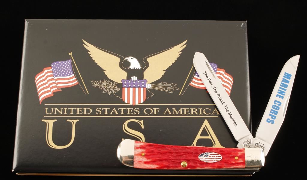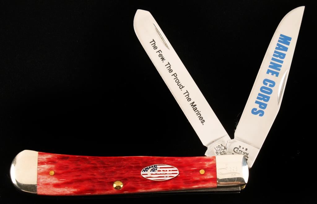 Marine Corps Commemorative, Model 398XX. Number 6254SS. Two bladed pocket knife, one blade is etched "The Few. The Proud. The Marines." "MARINE CORPS" in blue on other blade. Mint condition in original box with dust leaf. Page 203 of 'Pocket Traders Price Guide', Mint Price $45