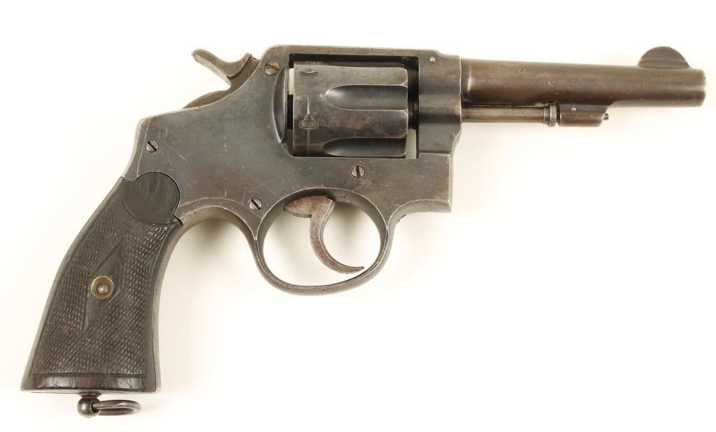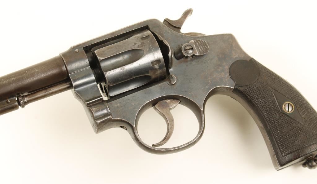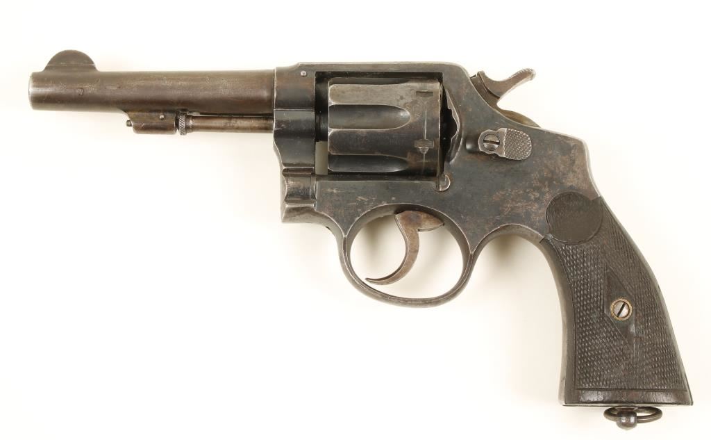 Blued Spanish made copy of a double-action 6-shot S&W revolver with a 4-3/8" pinned barrel that has an integral front sight. Finish is worn to a grey on the barrel and mottled dull blue-grey on the barrel and mottled dull blue grey on the frame. The checkered wood grips have the points worn down. Bore is primarily bright with good rifling. Chambers are shiny. Action is good with tight lock-up. Condition is fair to good. "Modern Firearm"