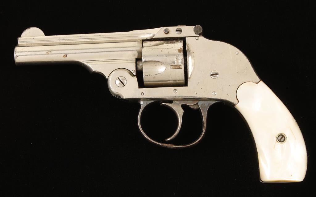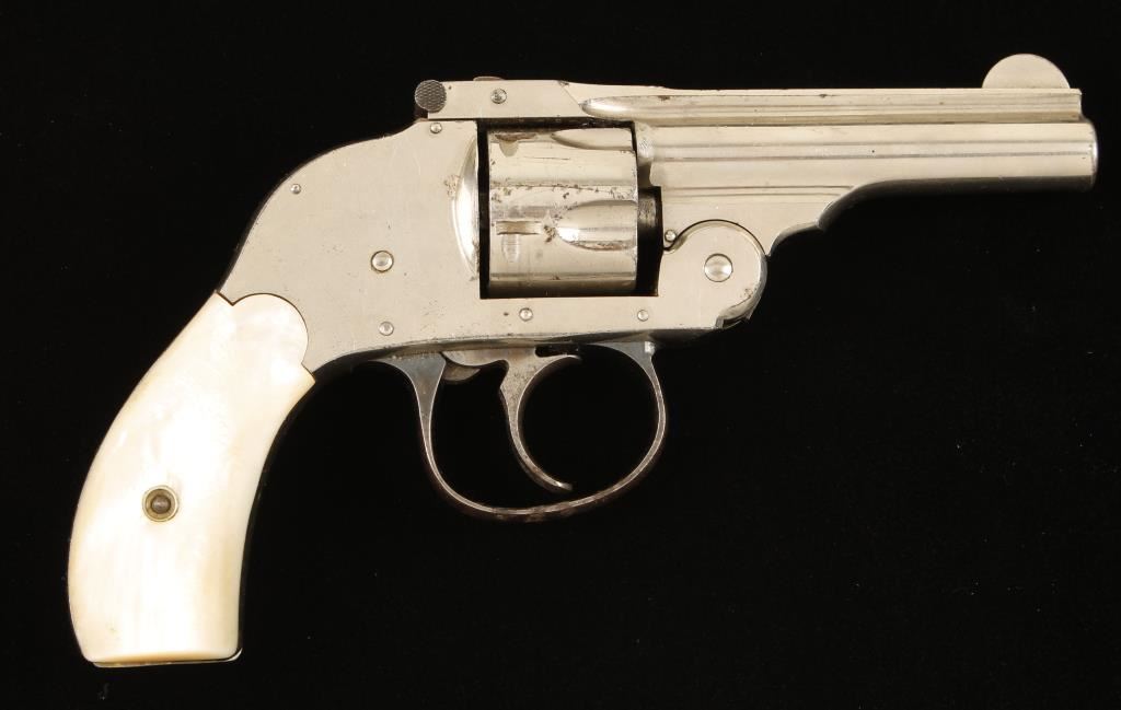 First Model nickel-plated top-break 5-shot double-action only hammerless small frame revolver with a 3" barrel and mother-of-pearl grips. Plating has some scuffs and scratches with a few penetrations that have turned to surface rust. Bore has sharp rifling with some pitting. The chambers are free of pitting. The grips are complete but there is a flat "facet" on the bottom of the left grip. The blued trigger guard has some surface rust on it and the bluing is faded in areas. The action works well and the lock-up is acceptable. Condition is fair. *Modern Firearm*