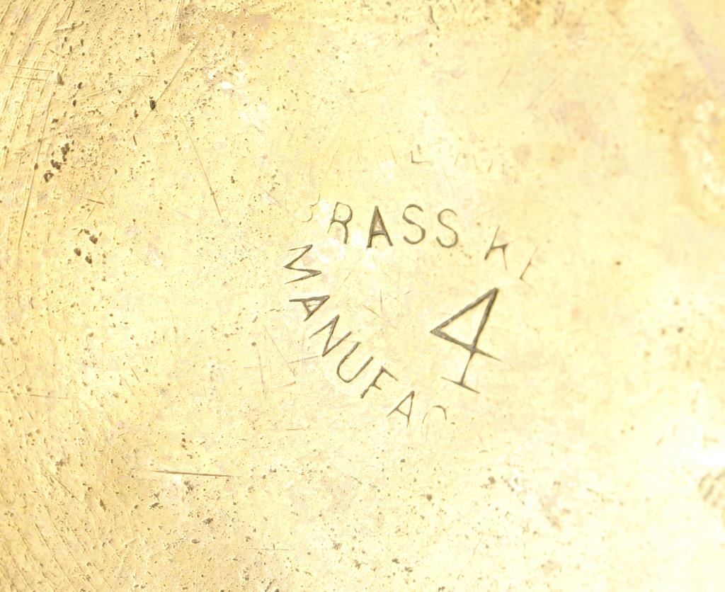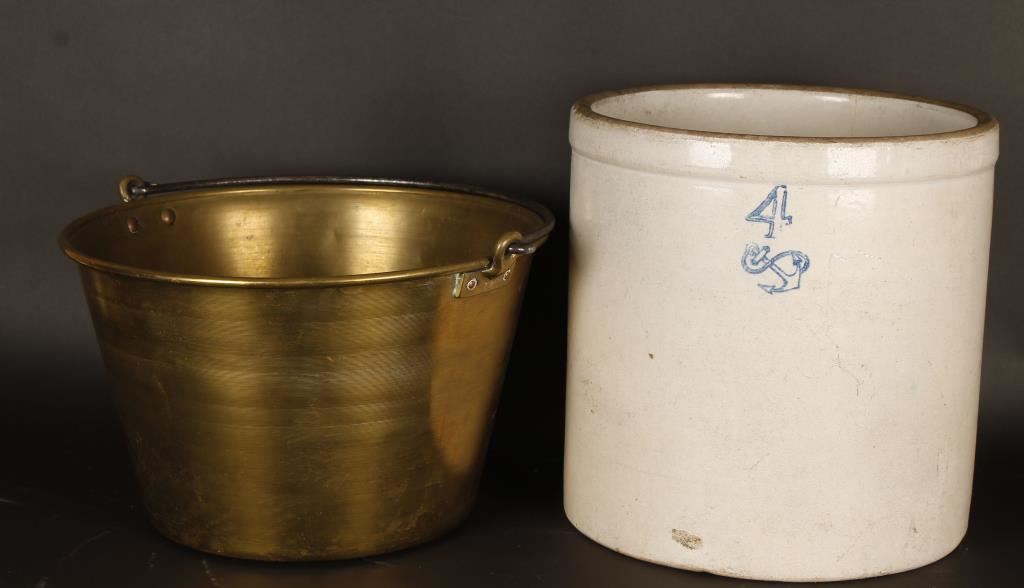 Stoneware crock with a blue '4' and anchor on the front, measures 11 3/4"x11 3/4". Brass bucket with metal handle measures 13 3/4"x9". Extra charge for shipping.