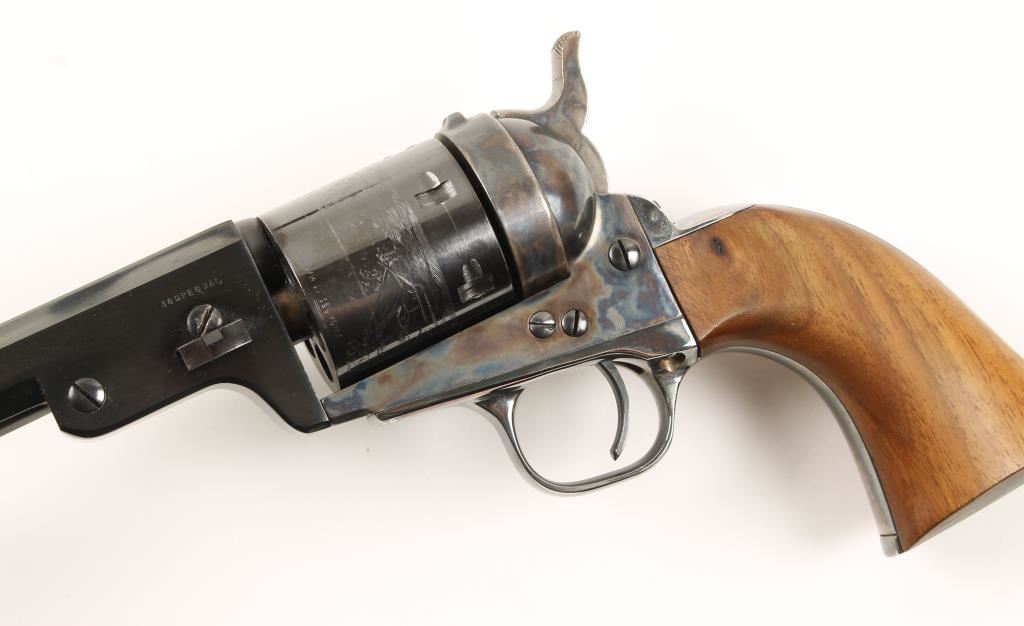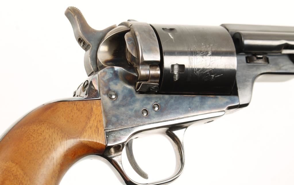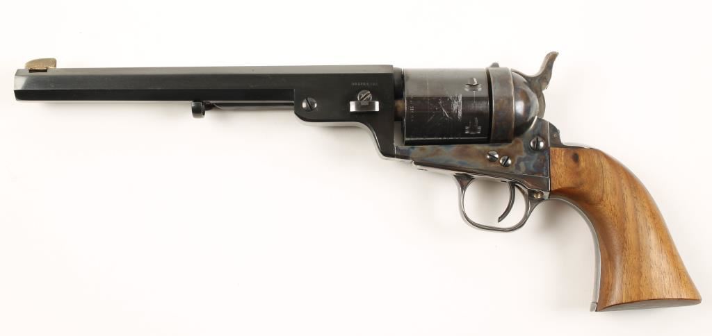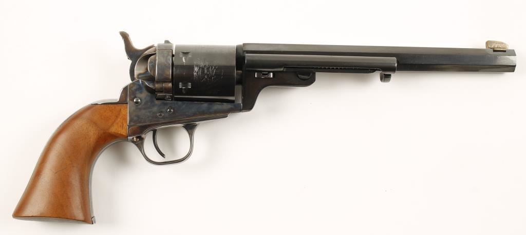 SN: 5415 .Six single action revolver chambered in .38 Special, modeled after a Colt 1851 Richards Conversion and done in the style of Wild Bill Hickok. Features a 7.5" blued octagonal barrel, brass blade sight, blued cylinder with naval scene, case hardened frame & hammer, silver plated backstrap & trigger guard and one piece walnut grips. Bore excellent , silver plating is tarnished and there is slight wear at the muzzle. Condition is excellent. ***Modern Firearm***