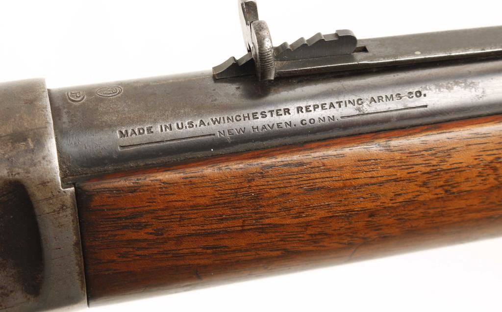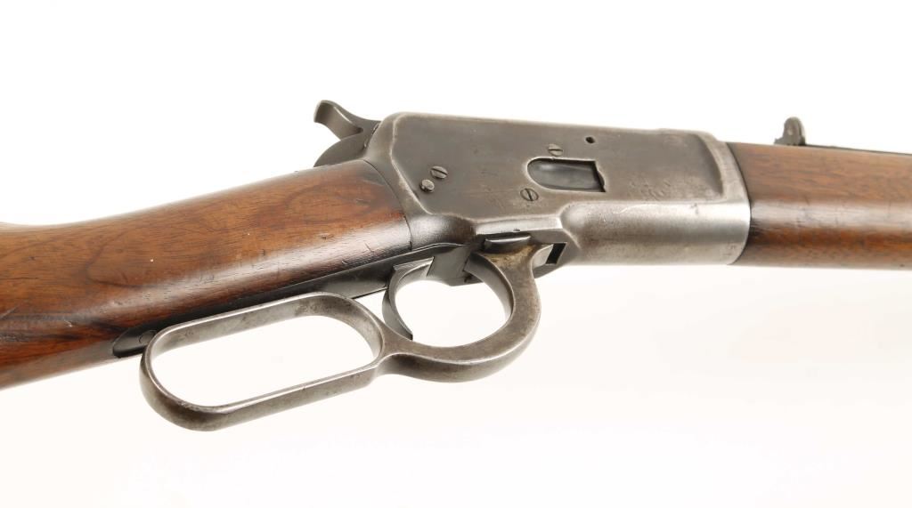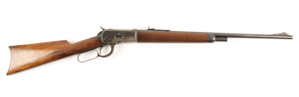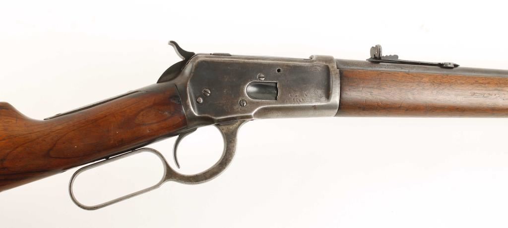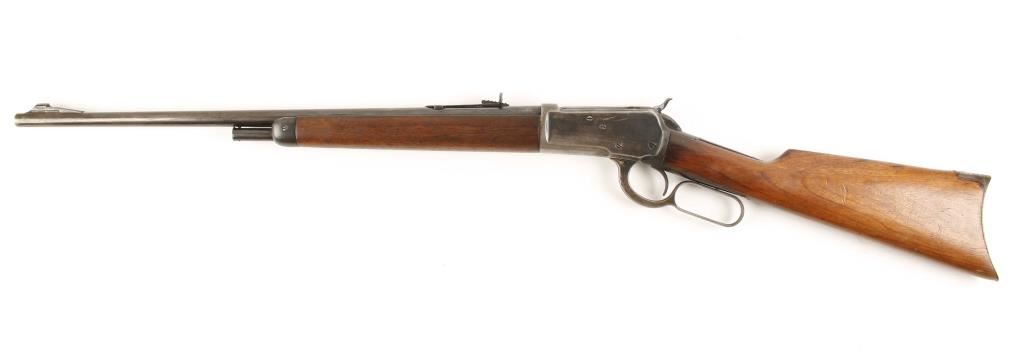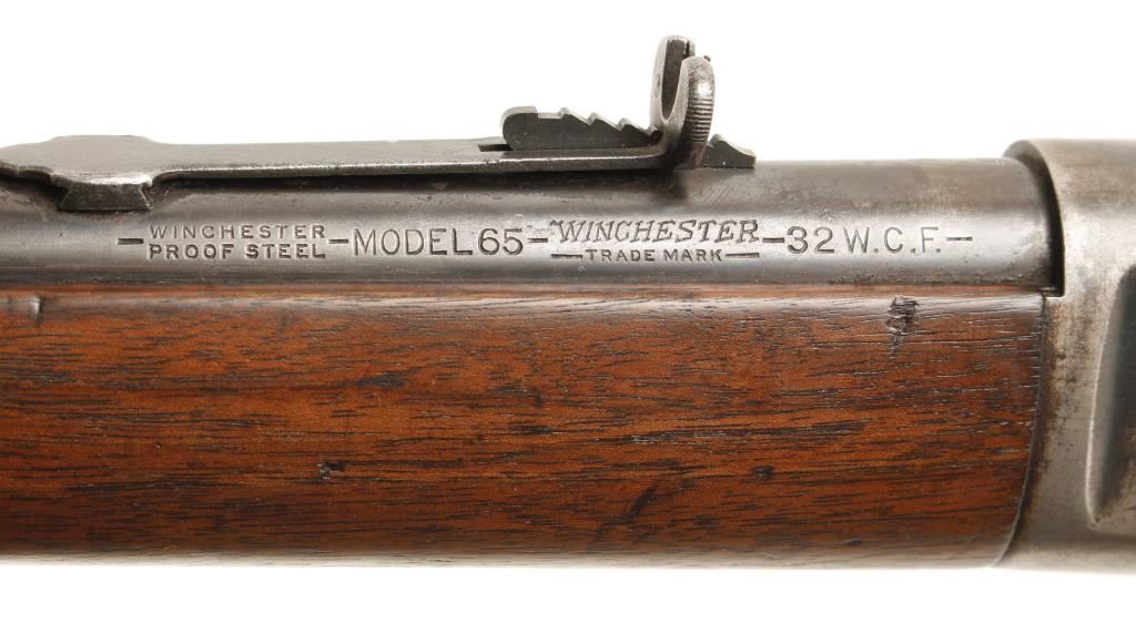 Lever action tube fed repeating rifle chambered in .32 Winchester Center Fire and manufactured in 1897. Fully blued rifle with replaced 22" blued barrel and half magazine tube from a model 65', ramped front sight with slot for a hood, adjustable rear sporting sights, plain walnut forend with cap and straight grip stock with crescent buttplate. Overall finish is 30% original blue with dark brown and light grey patina. Bore is very good , action is crisp as are the markings. Wood buttstock has scattered old mars and scratches from carry and usage. Overall condition is very good as antique. ***Antique Firearm***