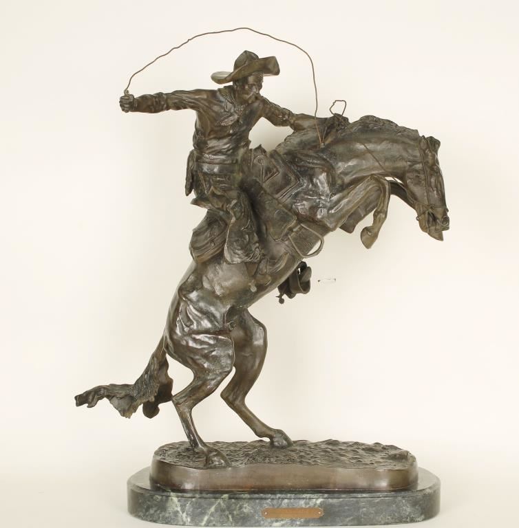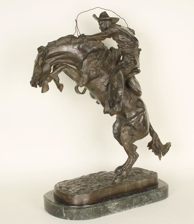 marked. Entitled "Bronc Buster" with greenish patina depicts cowboy on top of a bucking horse. Stamped Copyright Frederic Remington and 1/100. Great action piece! On marble base measures 26"X16".