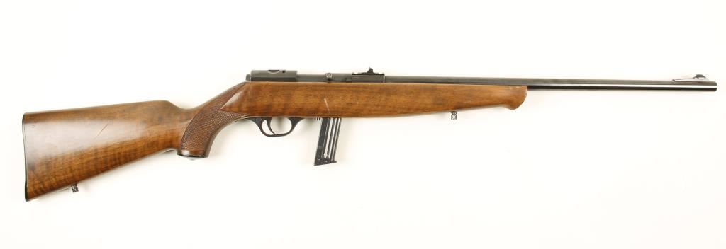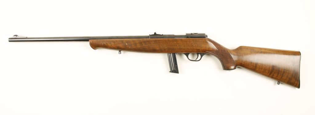 Fine Italian made semi automatic clip fed .22 caliber sporting rifle by Beretta. Features a 20.5" blued barrel, ramped front sight, two leaf folding rear sight, 12 round Smith & Wesson magazine, safety switch, swivel studs and checkered pistol grip wood stock. Condition is very good with moderate dents and dings to stock. ***Modern Firearm***