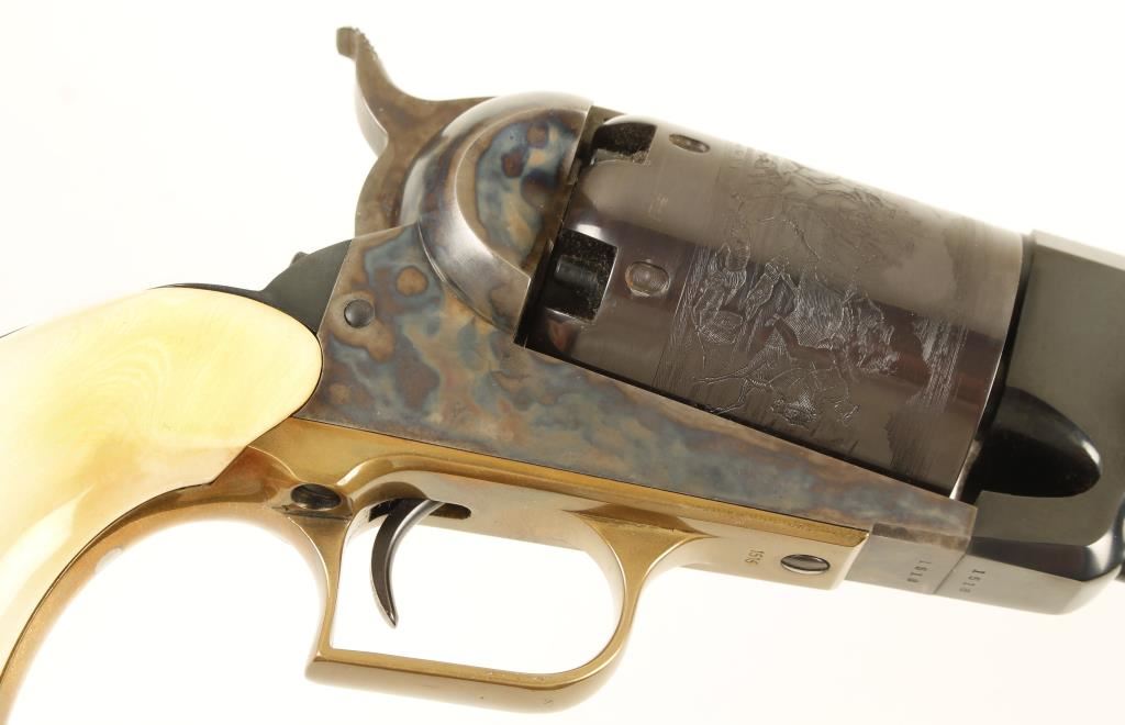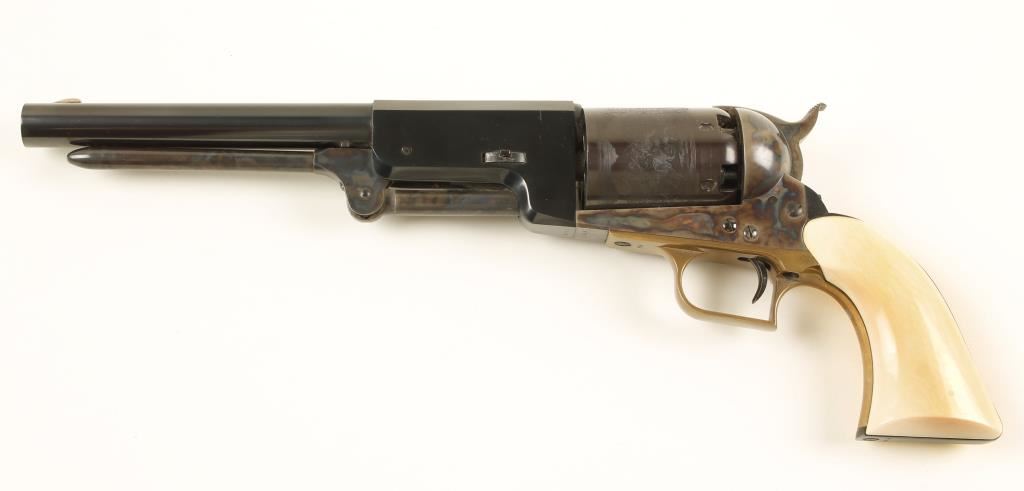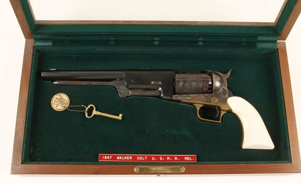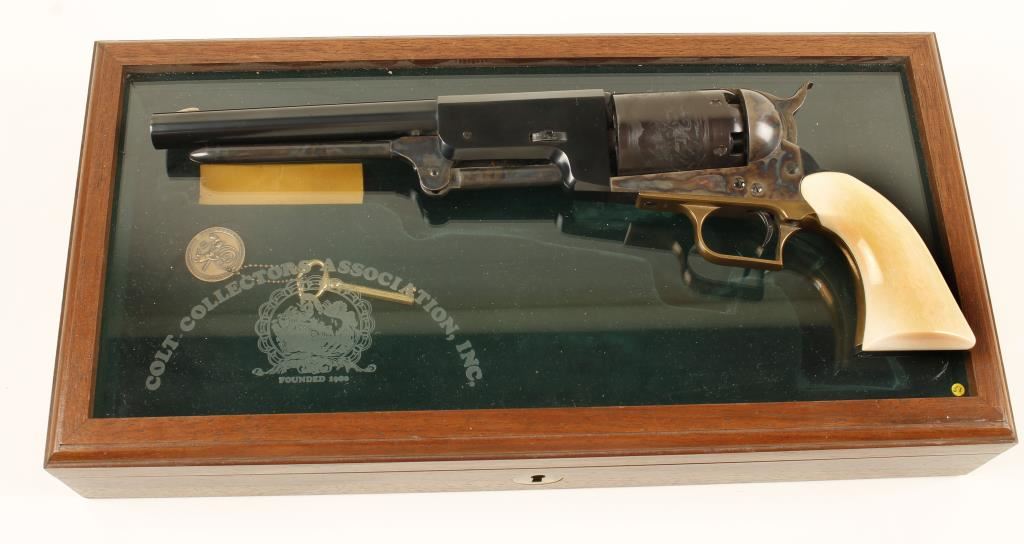 Second generation Colt 1847 Walker in glass top wood Colt Collector's Association presentation case with genuine Ivory grips. Ordered by a prominent Colt collector, estimate cost of grips is over $1,200. Comes with nipple wrench, key & plaque that reads "1847 Walker Colt U.S.M.R. Mdl". In near fine condition.