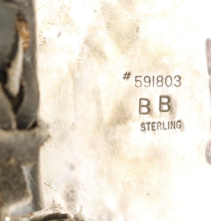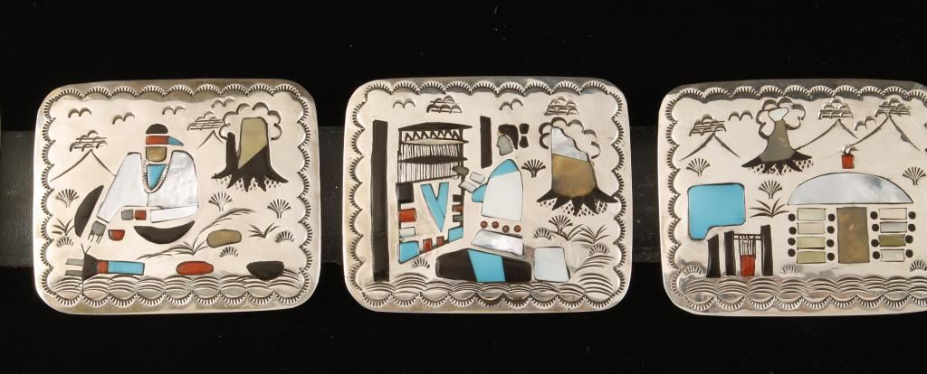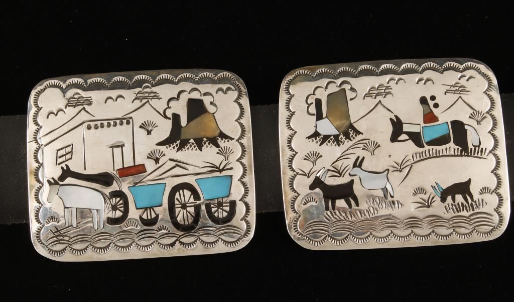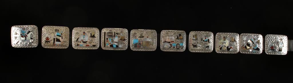 Inlaid with turquoise, onyx, mother of pearl, spiny oyster, and more. Set in sterling silver signed 'BB' with 10 conchos. Retail $2200. Size 34 on black leather belt.