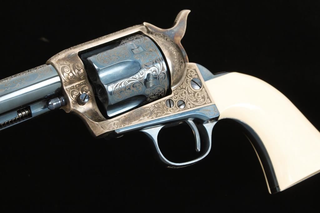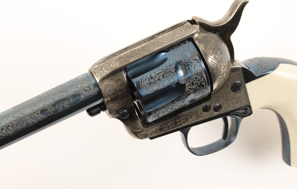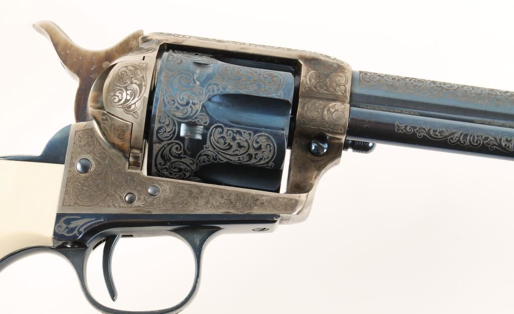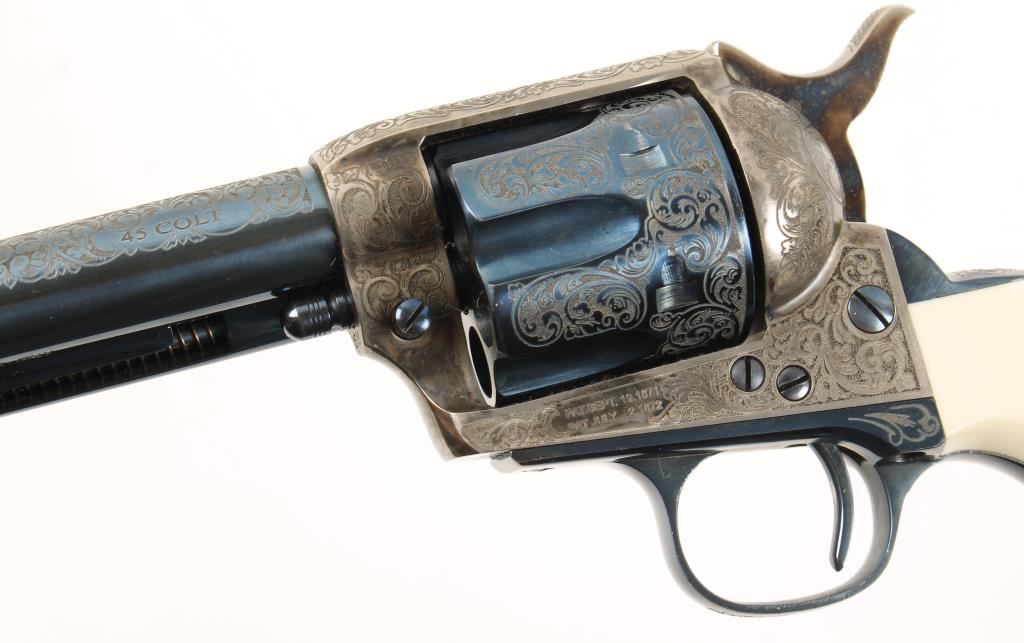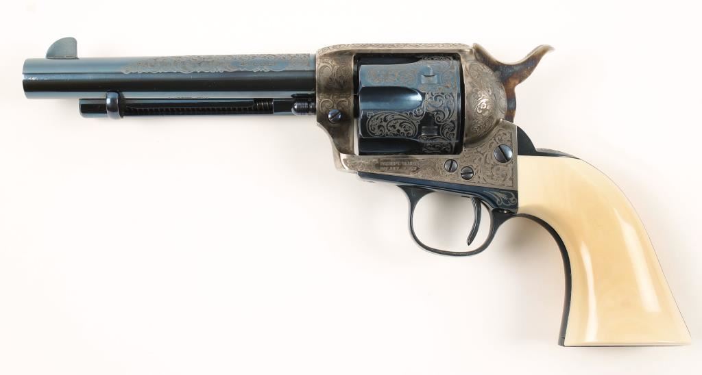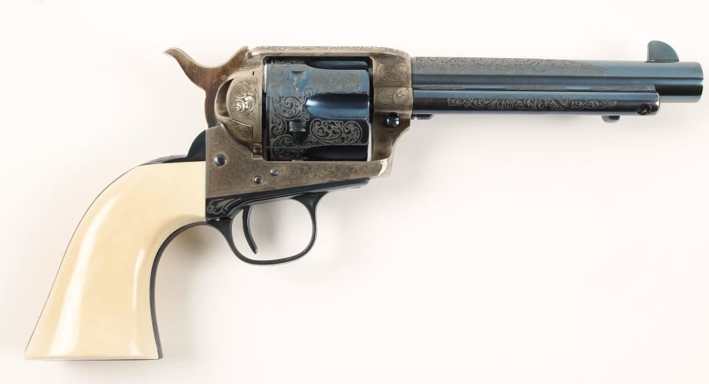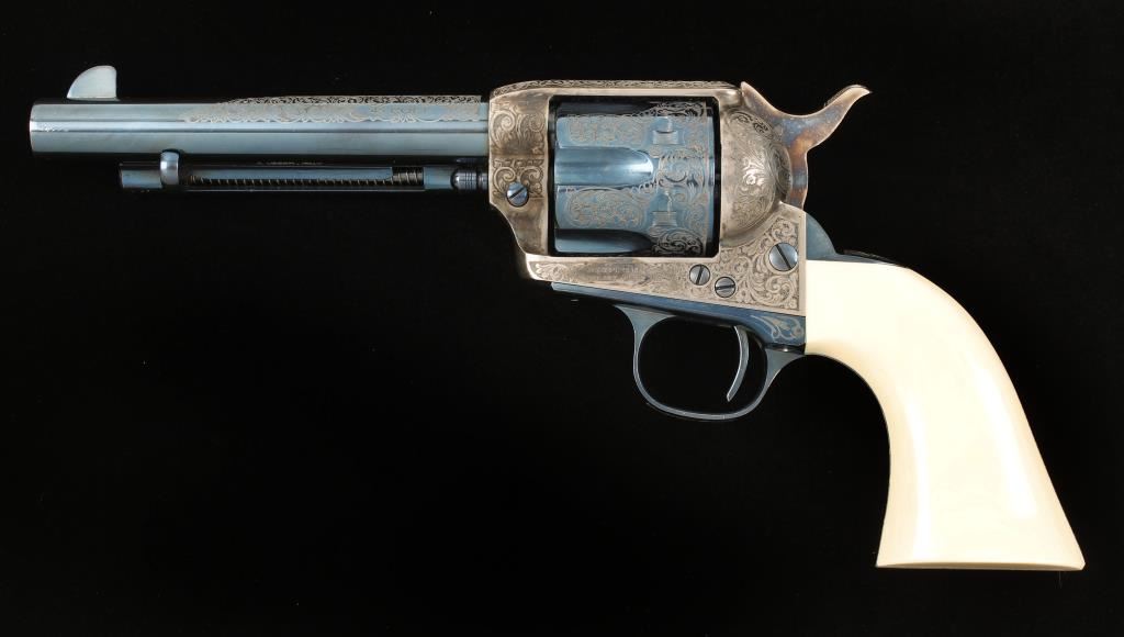 Laser engraved six shot single action revolver in .45 Colt manufactured by A. Uberti. Features an engraved 5.5" fire blued barrel, engraved case hardened frame, case hardened hammer, engraved fire blue cylinder, backstrap, trigger guard & ejector rod housing, fire blue trigger and simulated ivory grips. Bore is excellent and likely unfired. Condition is like new in box. ***Modern Firearm***