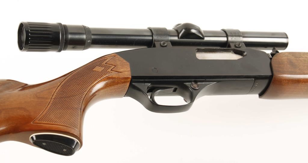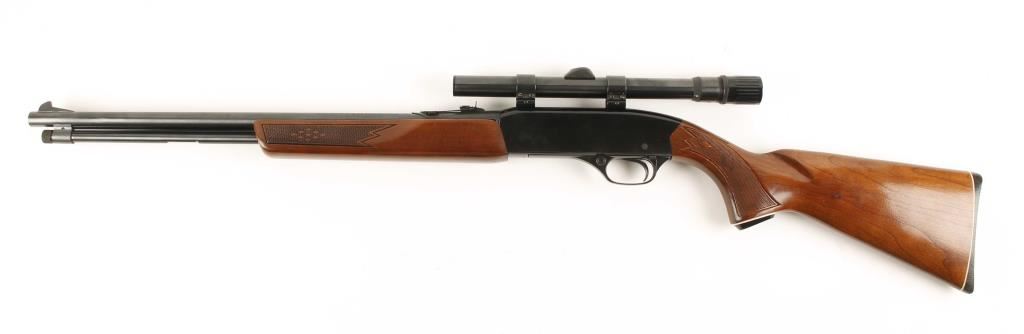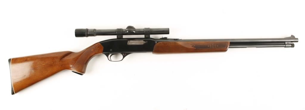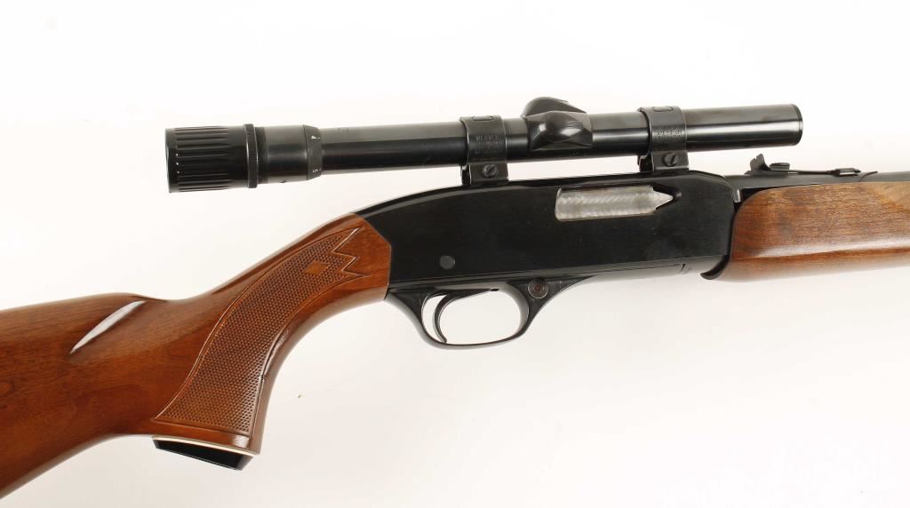 Slide action tube fed repeating fire chambered in .22 Winchester Magnum. Fully blued rifle features a 20.5" barrel, full magazine tube, ramped front sight, adjustable rear sporting sight, installed Weaver V-22 3x-6x variable power scope, safety switch and checked walnut slide handle and pistol grip buttstock. Finish shows 98% original blue and very little wear. Bore is very good and action is crisp. Condition overall is excellent. ***Modern Firearm***