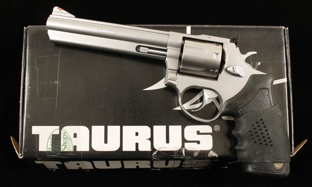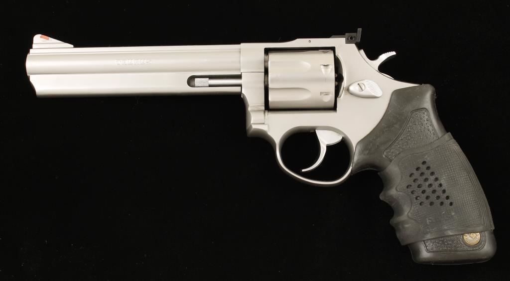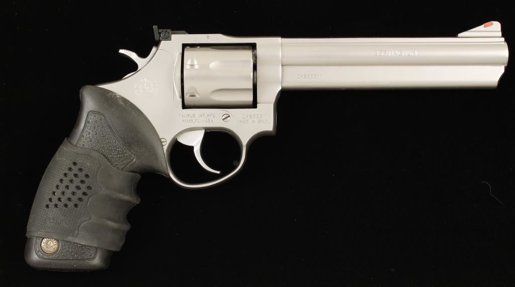 Double action 7 shot .357 Magnum revolver by Taurus. Features a 6" stainless barrel, ramped front sight with orange insert, adjustable rear sight, stainless cylinder & frame and rubber medallion grips with Pachmayr finger grove sleeve. Includes factory box with tools. Condition is excellent. ***Modern Firearm***