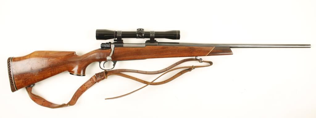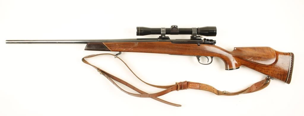 Modern commercial Mauser 98 action with a 24" Wilson Custom barrel with strong rifling and a bright bore. Comes with a Leupold M8-4X Scope, a sling and a leather saddle scabbard. The bluing shows some small scratches and scabbard wear on the barrel. The receiver and bolt shroud are in good condition. The in-the-white bolt handle has some fine pin prick pitting. The scope shows edge wear on the bells and turrets. The last lens on the scope is scratched. There are Leupold detachable scope rings. The non-ferrous hinged floor plate and trigger guard have edge wear to their finish. The walnut Monte Carlo stock has many dings and rubs with a few that are large and deep. Action is fine. Condition is good. Modern Firearm*