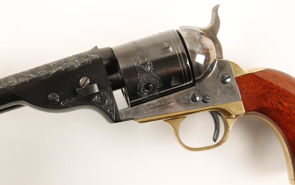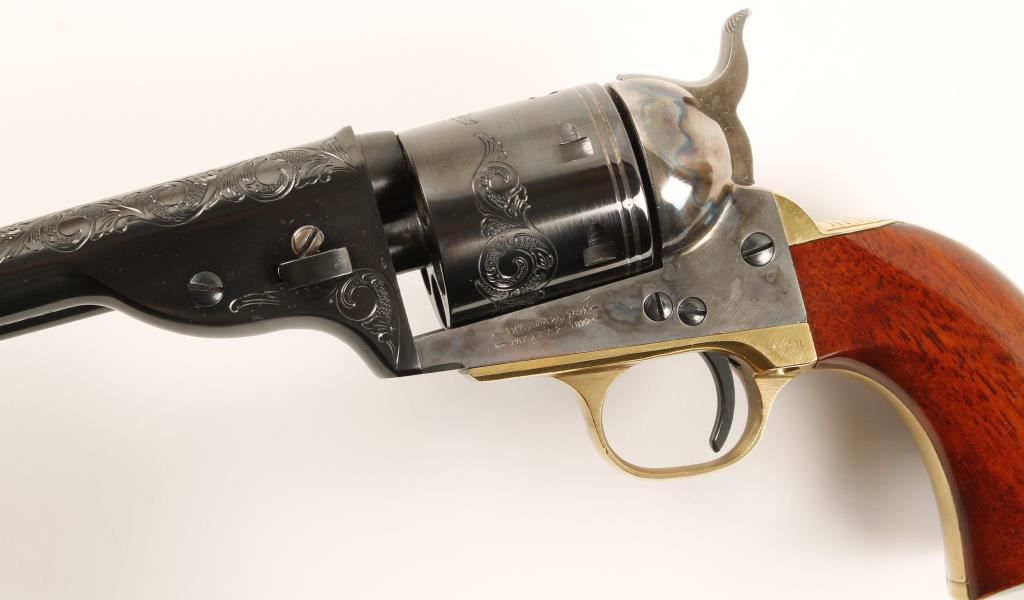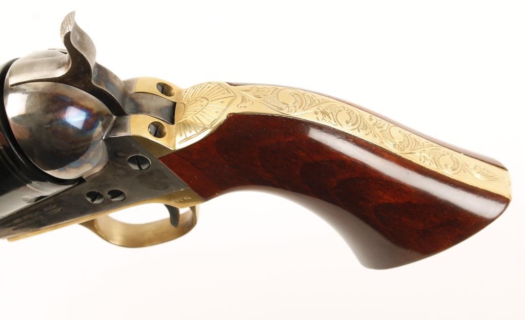 Engraved Italian made six shot single action revolver chambered in .44 Colt, modeled after the 1872 Colt Open Top. This revolver has been finely engraved & inlaid by Jim Downing and been custom finished, tuned, honed and fitted. Features an engraved 4.75" sheriff's length blued barrel, fixed sights, blued engraved cylinder. case hardened frame & hammer, blued trigger, one piece walnut grips engraved brass backstrap and brass trigger guard. Bore is perfect and appears unfired. This gun appears in Jim Downing's book "The Gun Engraver" Condition is like new in box. Includes a letter from Jim Downing that is signed and names manufacture and serial number and date in which he engraved it. ***Modern Firearm***