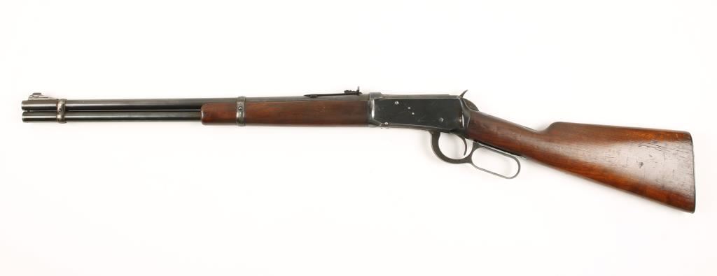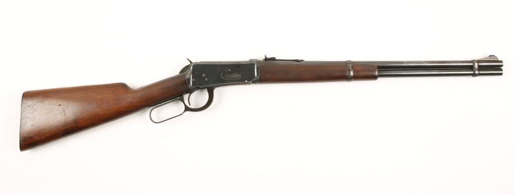 Lever action tube fed sporting rifle chambered in .25-35 Winchester Center Fire and manufactured in 1942. Fully blued rifle with a 20" barrel, full magazine tube, ramped front sight, buckhorn rear sight, walnut forend and straight grip stock with metal buttplate. Rifle retains 85% of it's original blue finish and wood remains in good condition with dents and scratches. Bore is dark with strong rifling and action performs smoothly. Condition is very good. ***Modern Firearm***