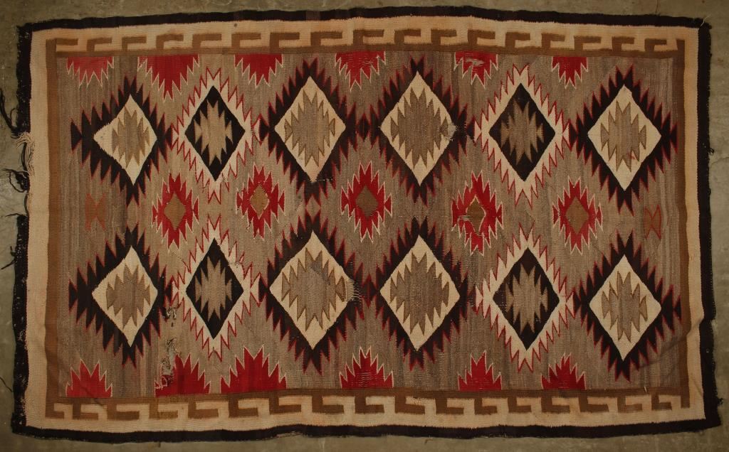 Large wool woven rug in geometric pattern with beige, brown, red, and grey materials. Rug has many flaws including color bleeding,rips and fraying. Overall condition is fair, measures 80"x 50".