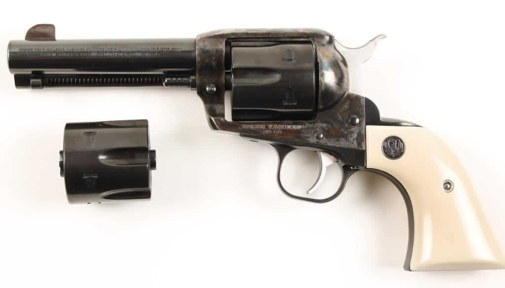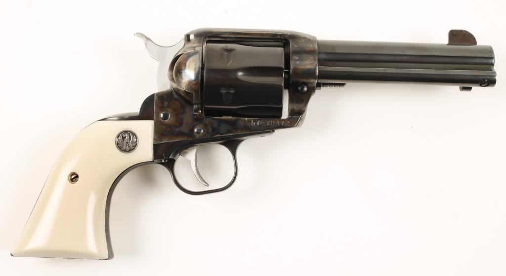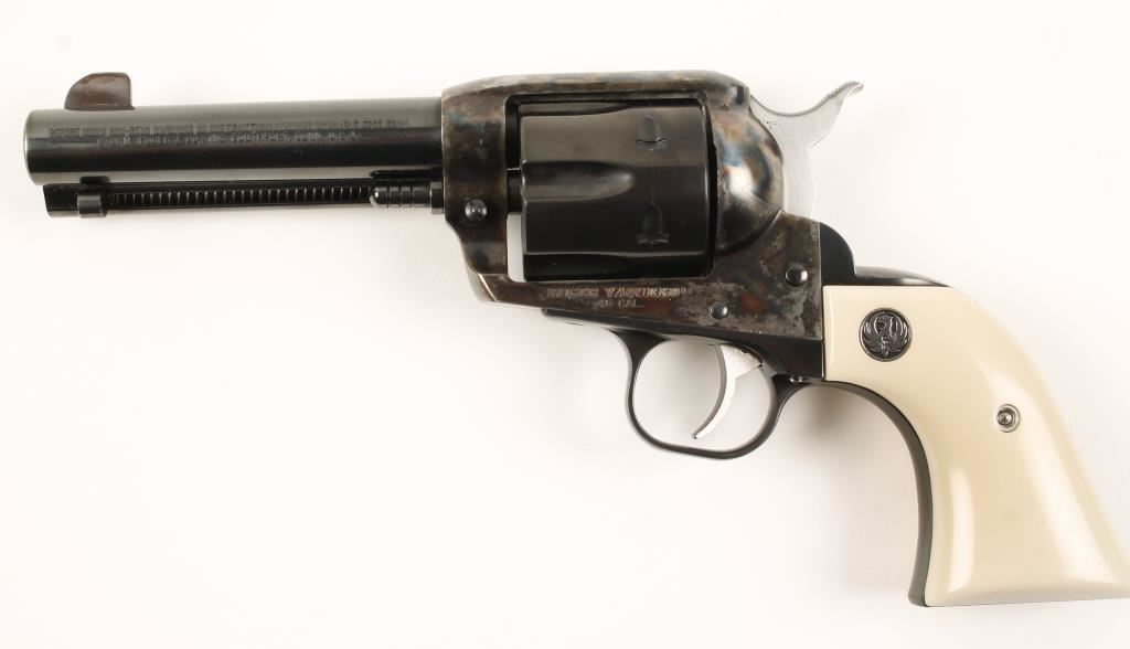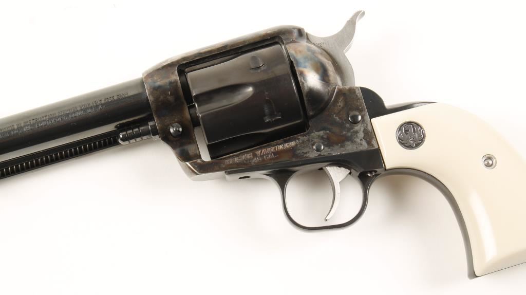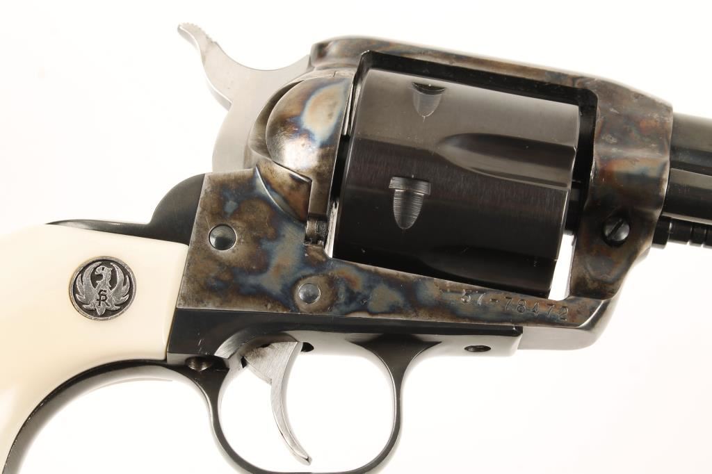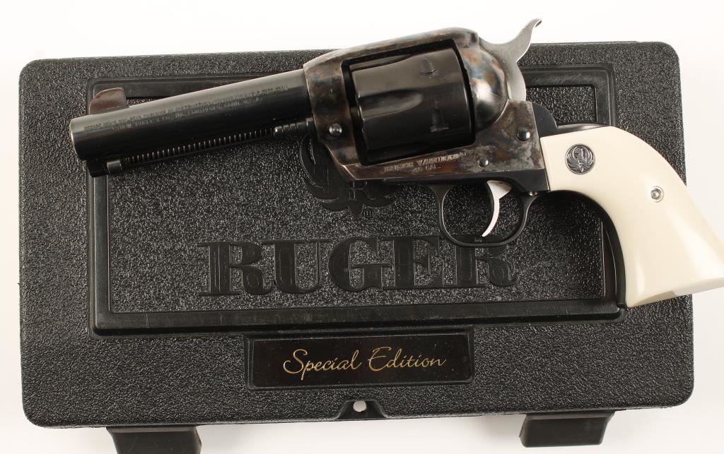 Special Edition six shot single action revolver chambered in .45 caliber and includes two cylinders, .45 Colt & .45 ACP. This revolver has been custom re-finished, tuned and re-fitted for cowboy action shooting/re-enacting. Features a 4.75" blued barrel, front blade sight, blued hammer, cylinder, backstrap, trigger & trigger guard. case hardened frame, and simulated ivory medallion grips. Bore is excellent. Condition is excellent in box. ***Modern Firearm***