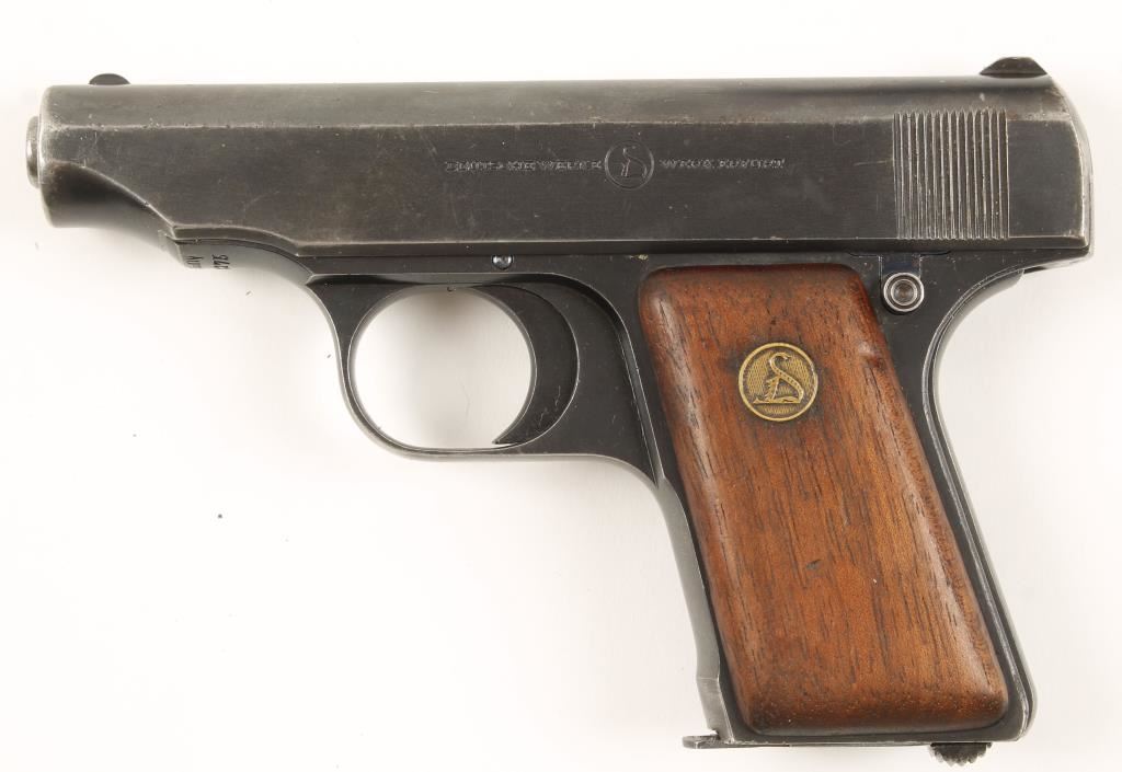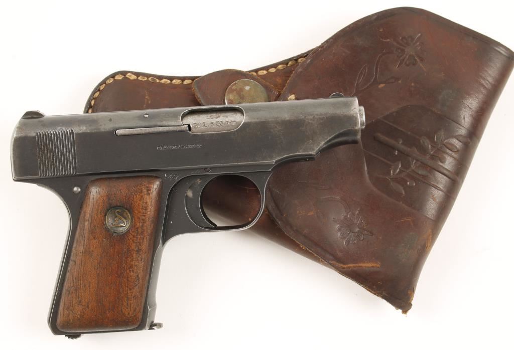 Small German made semi automatic pistol chambered in 6.35mm. Fully blued pistol features a 2.75" steel barrel, fixed sights, Deutsche Werke medallion wood grips and Nitro commercial proofed frame, trigger and slide. High edge wear around muzzle but otherwise a high condition gun with light scattered pitting. Includes brown leather flap holster. Bore is good with good rifling and action is smooth. Condition is very good+. ***Modern Firearm***