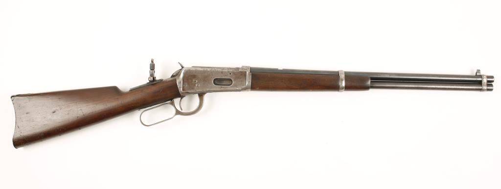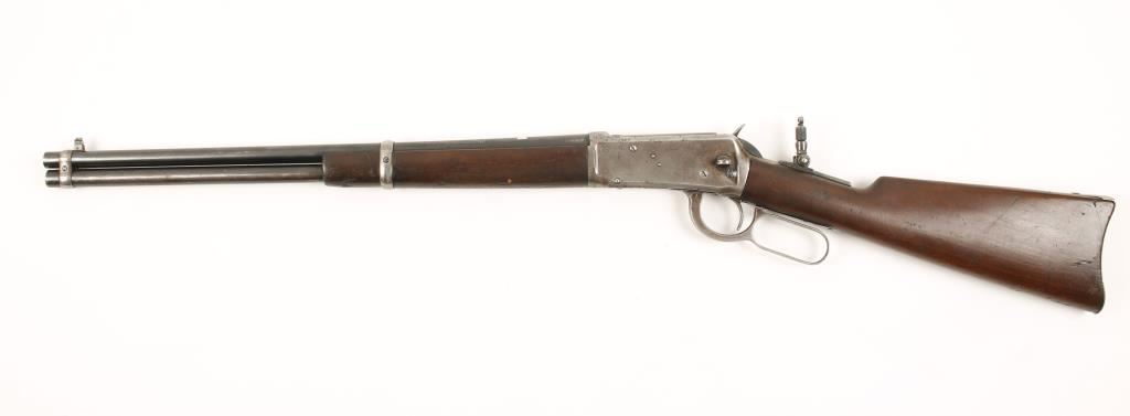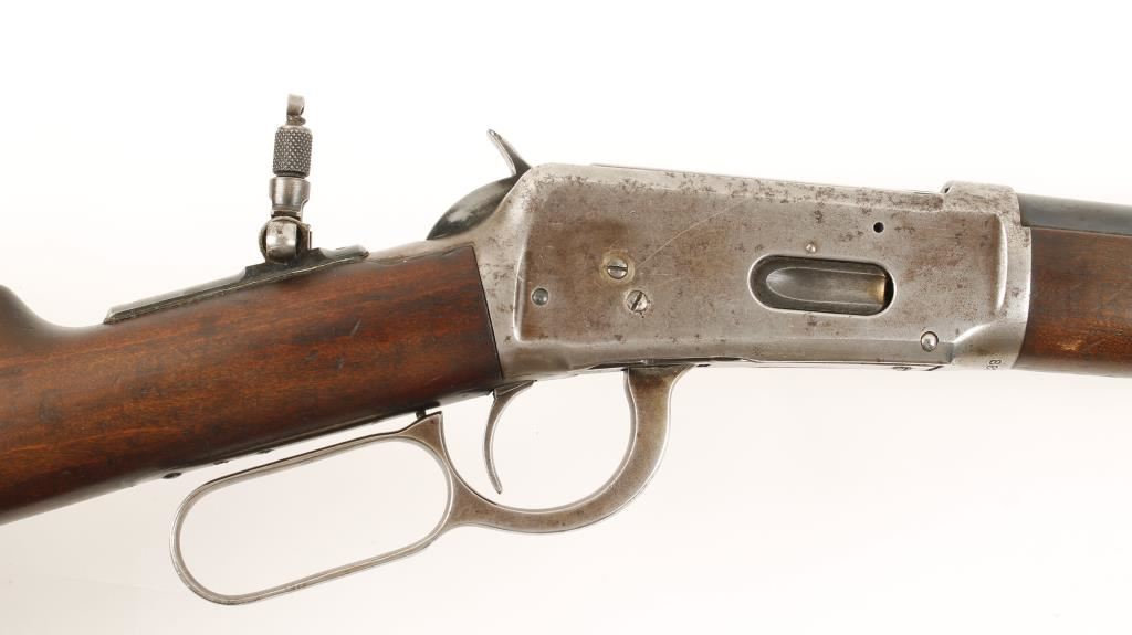 Tube fed lever action sporting rifle chambered in .25-35 Winchester Center Fire and manufactured in 1922. Fully blued saddle ring carbine with 20" barrel, full tube magazine, Marble front sight, removed rear sight, Lyman tang peep sight with dual aperture, removed saddle ring and plain walnut forend and straight grip stock with metal carbine buttplate. Finish is strong on barrel, top of magazine tube and on hammer. Receiver and lever turning to a light grey patina with light scattered pitting. Wood is in good+ condition with dents and scratches. Bore is dark with good rifling and action performs well. Condition is good to very good. ***Modern Firearm***