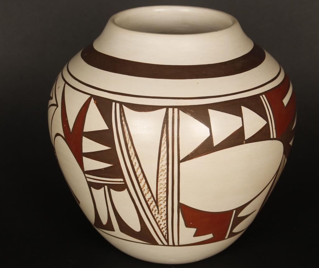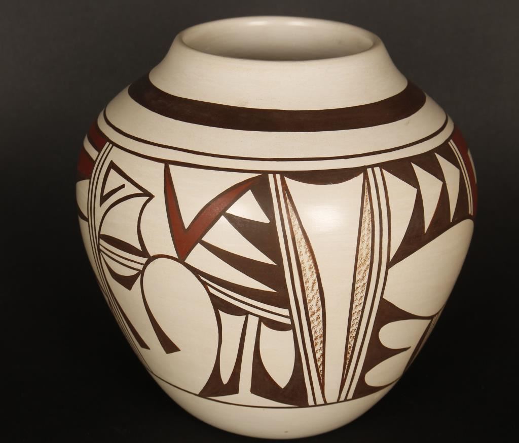 Frog Woman Pot with polychrome finish over white pot with geometric pattern. Signed Joy Navasie with frog effigy on the bottom. Measures 7"x6".