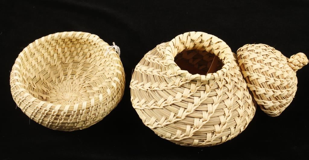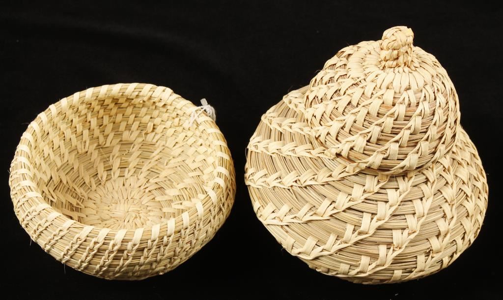 Both constructed of bear grass for filler in the coil and yucca for the white cover. Including a lidded basket measuring 7" x 6.5" x 6.5" and a basket measuring 2.75" x 6" x 6".