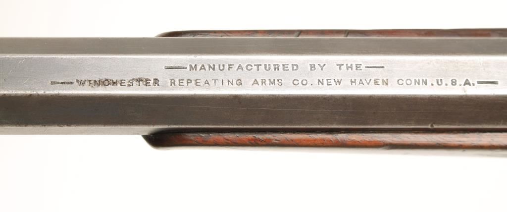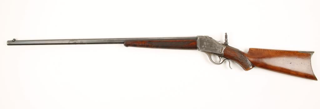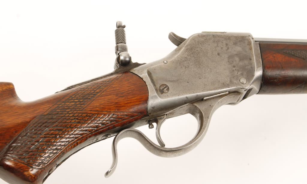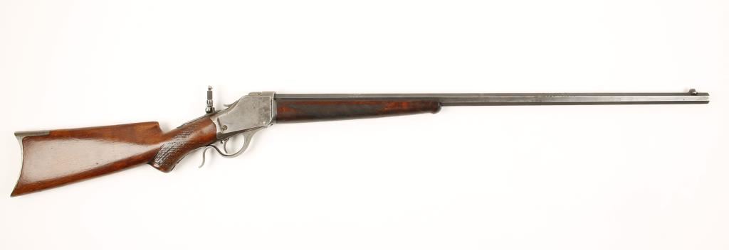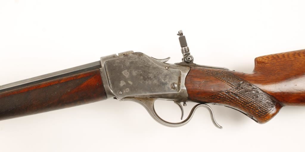 Falling block single shot sporting rifle chambered in .32 WCF and manufactured in 1887. Features a 28" blued octagonal barrel, Lyman front sight, rear sight slot on barrel has been filled in with lead, in the white thin side receiver, tang peep sight with dual apertures, single trigger, walnut hand checkered forearm and stock with crescent buttplate. Bore is very good with strong rifling, finish on barrel is 50%+ remaining but has pitting and all markings on barrel remain sharp. Action functions very well, light scattered pitting on receiver, wood has some dents/dings . Condition is very good. ***Antique Firearm***