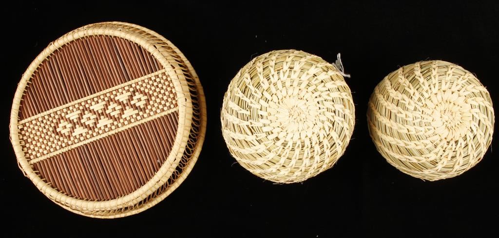 (2) Traditional Gathering Baskets-5" and 5 1/2". (1) Basketry Tray With A Reed Base And Eye Dazzler Pattern-8".