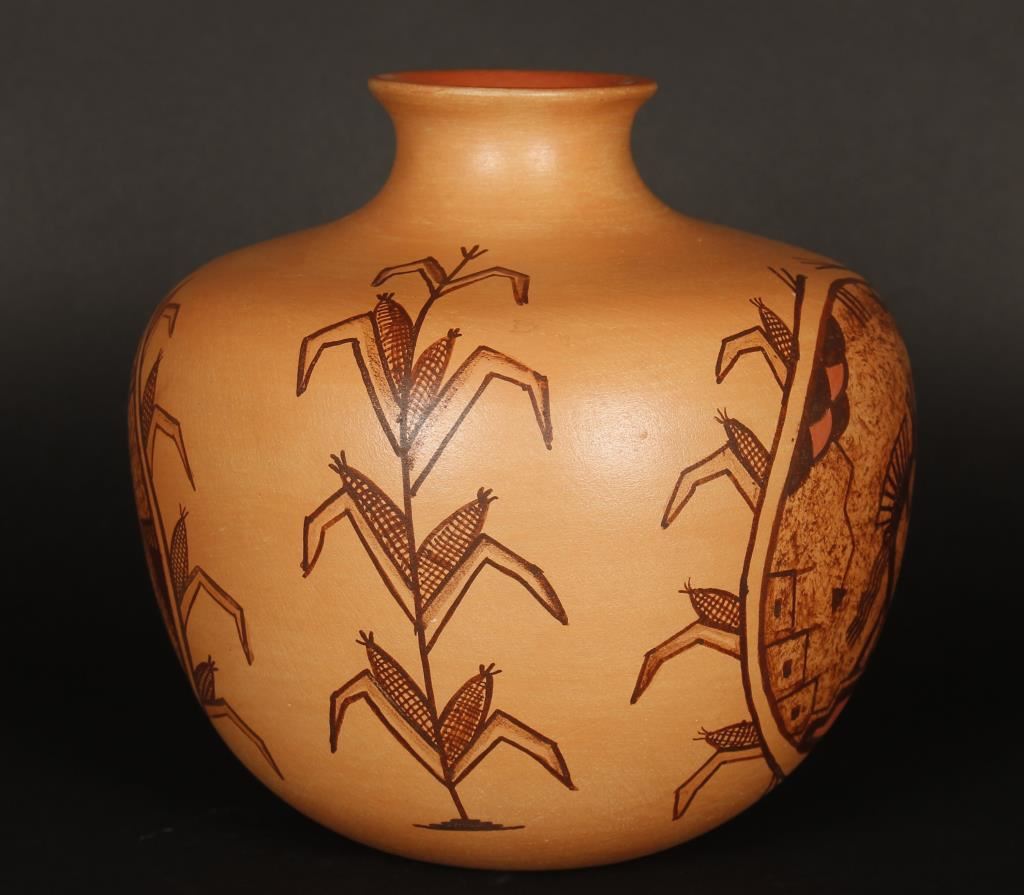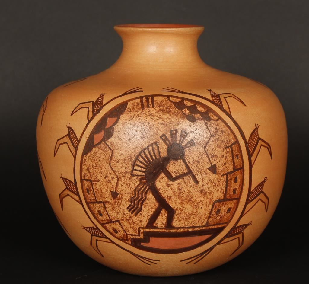 Hand coiled and painted vessel by well known Hopi artist Tom Polacca, who is now deceased. This pot features a terracotta color background with Kokopellis, storm clouds, lightning, and stalks of maize. Measures 6" x 6" x 6"
