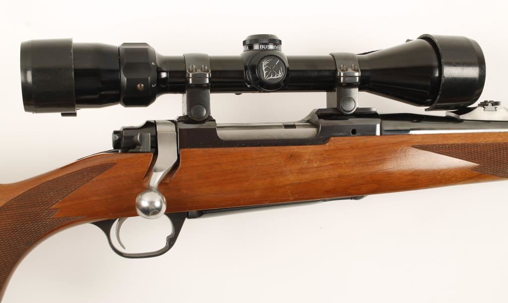 Bolt action sporting rifle chambered in .243 Winchester. Features a blued 18.5" tapered barrel, front blade sight, folding leaf rear sight, mounted Bushnell 3x-9x scope, bent stainless steel bolt handle, safety switch on bolt, internal box magazine, black wood forearm tip and checkered walnut stock with rubber recoil pad. Bore is very good and action is smooth. Condition is very good. ***Modern Firearm***
