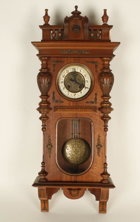 Nicely carved oak clock with several brass embellishments across the cabinet. Glass sides allow a view of the inner mechanisms. Ornate brass pendulum and a key for winding. Measures 33"x13"x6".