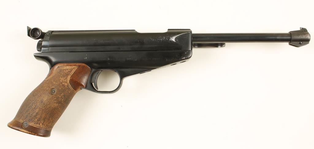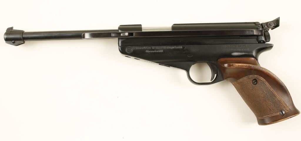High quality German made single shot pump air pistol in .177 caliber. 7" barrel, blue finish & wood target grips. Includes original foam shipping container addressed to Mr. Swanwick, a noted Olympic target shooter. Condition is very good with light wear on gun & moderate wear on grips. ***Modern Firearm***