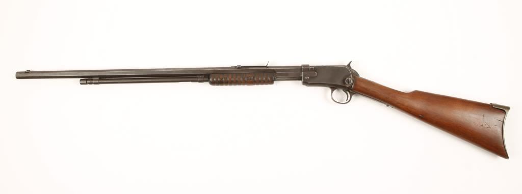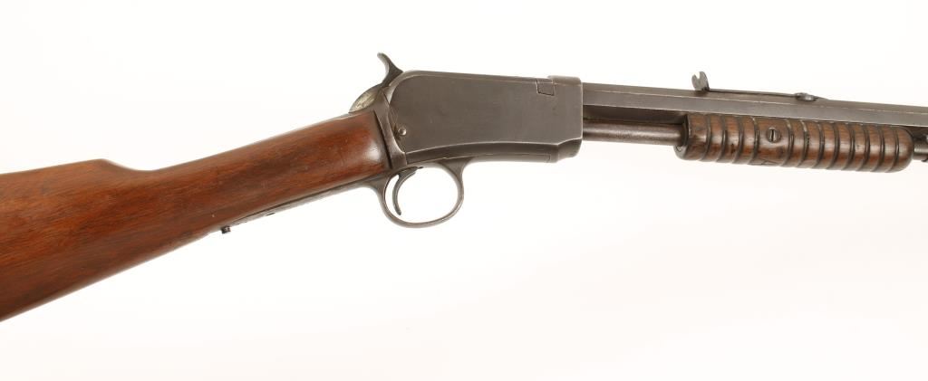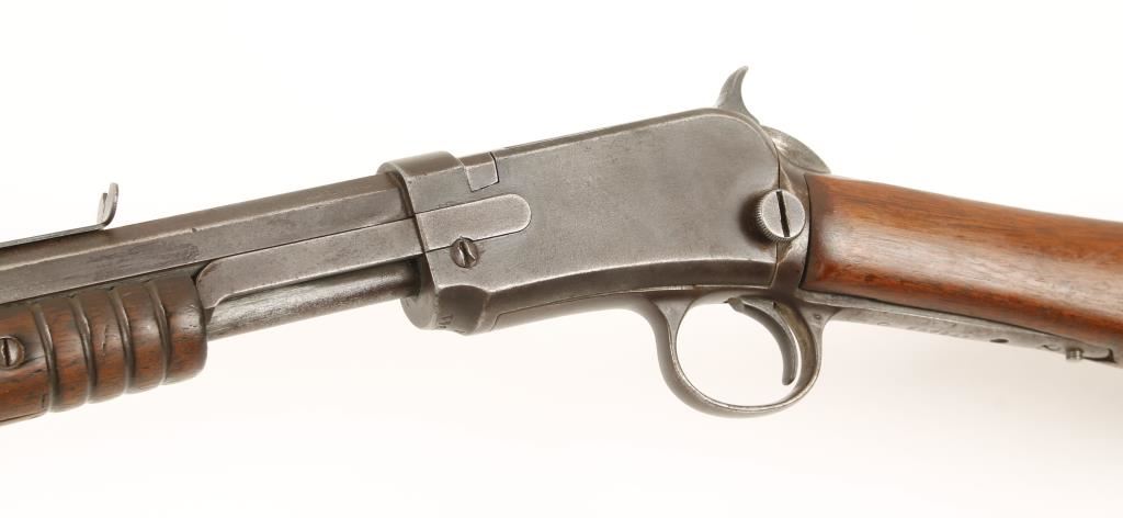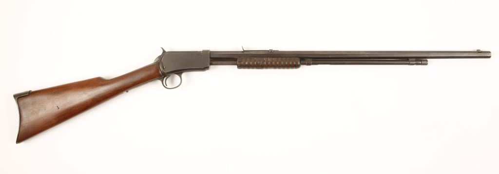 Third model take-down slide action tube fed sporting rifle chambered in .22 Long and manufactured in 1914. Features a 24" blued octagonal barrel, tubular magazine, period front sight, replaced modern rear sight, take-down receiver, twelve groove walnut slide handle with the letters "AL" carved in it and straight grip ill-fitting walnut stock with ill-fitting crescent buttplate. Bore is in fair condition, action functions well and rifle overall has a dull blued patina with light scattered pitting. Condition is good. ***Modern Firearm***