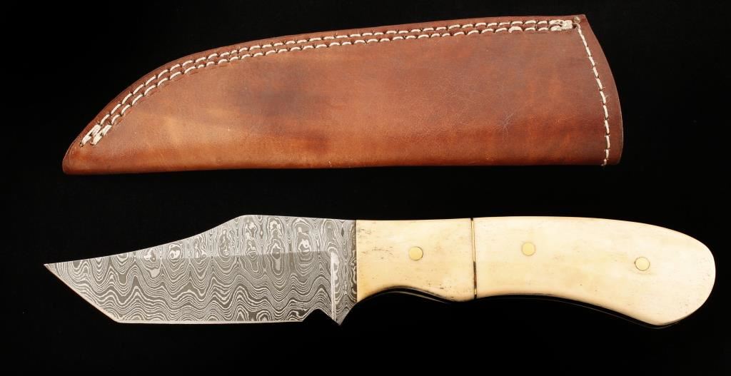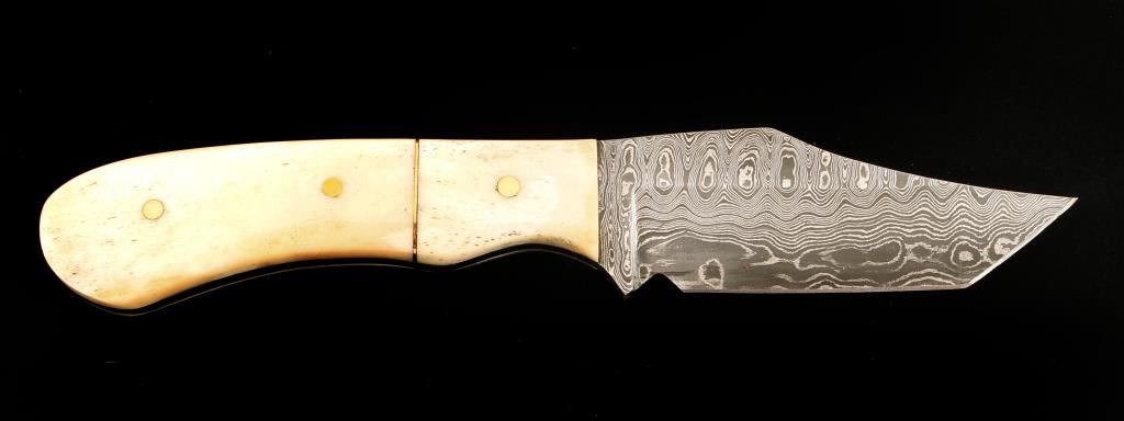 9.5" with a polished deer bone and brass handle. Unique blade is 4.5" and the handle is 5". Comes with handmade genuine leather sheath. Custom made by Kevin Johnson.