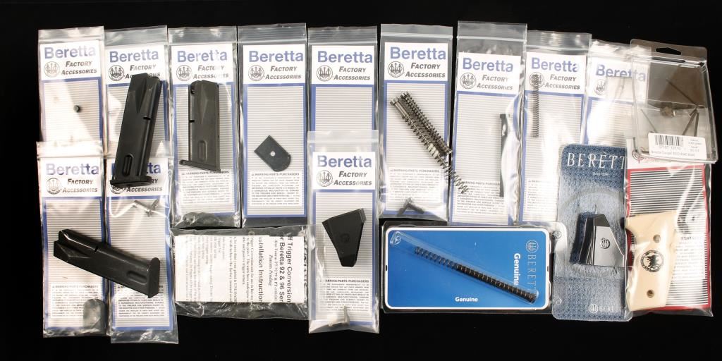 Large compilation of Beretta parts, mostly for the Beretta 92 model, and a lot of Beretta factory accessories new and used. Includes magazines, speed loaders, grips, springs, magazine bottoms, guide rod, trigger, bushings, disassembly levers and more.