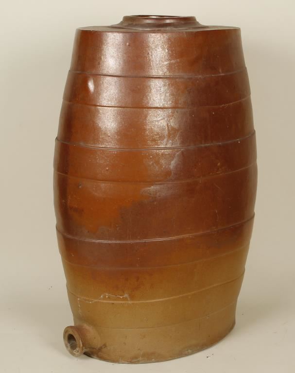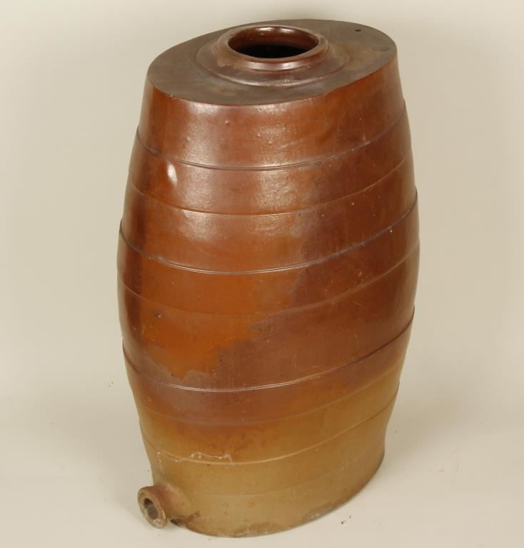 Glazed gold tone on bottom to terra cotta color towards the top with spout on the bottom. Measures 31"x18". A few chips around edges, otherwise good condition. Missing the lid. Nice heavy piece. Extra charge for shipping.