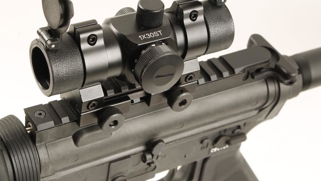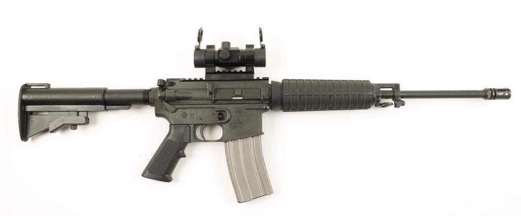 Tactical semi automatic rifle chambered for either .223 Remington or 5.56 NATO modeled after the Colt CAR-15. Features a 16" parkerized barrel with flash hider, bayonet lug, collapsible stock, composite upper & lower receiver, aluminum upper mounting rail, thumb safety, push button magazine release, mounted red dot variable power scope, handguard and 30 round magazine. Finish appears to have no wear, bore is excellent as it the action. Includes nylon sling. Condition is like new in box. ***Modern Firearm***