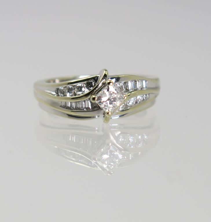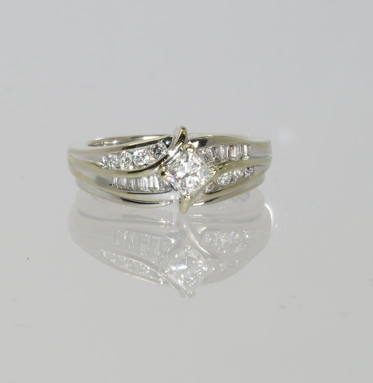 Features a princess cut diamond weighing approx 0.34 carats and 22 round and baguette cut diamonds weighing approx. 0.50 carats with G-H colors and VS/SI clarity set in 14 karat white gold.