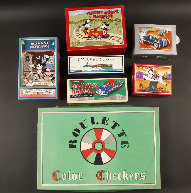 Including; "Walt Disney's Mickey Mouse in Maestro Mickey" trinket box and Disney Mickey Mouse Handcar in box, 4 Schylling Collectors Series toys all in boxes-Mechanical Rocking Cowboy, Speedway Racer, Speedboat, and Student Driver. All in working condition. Includes Color Roulette Checkers game.