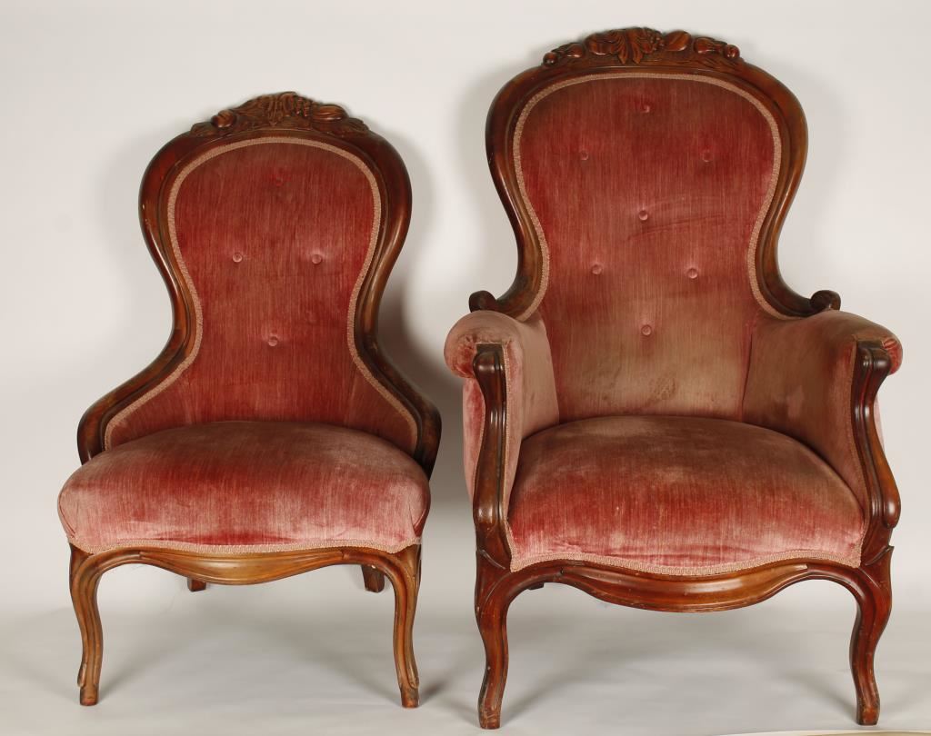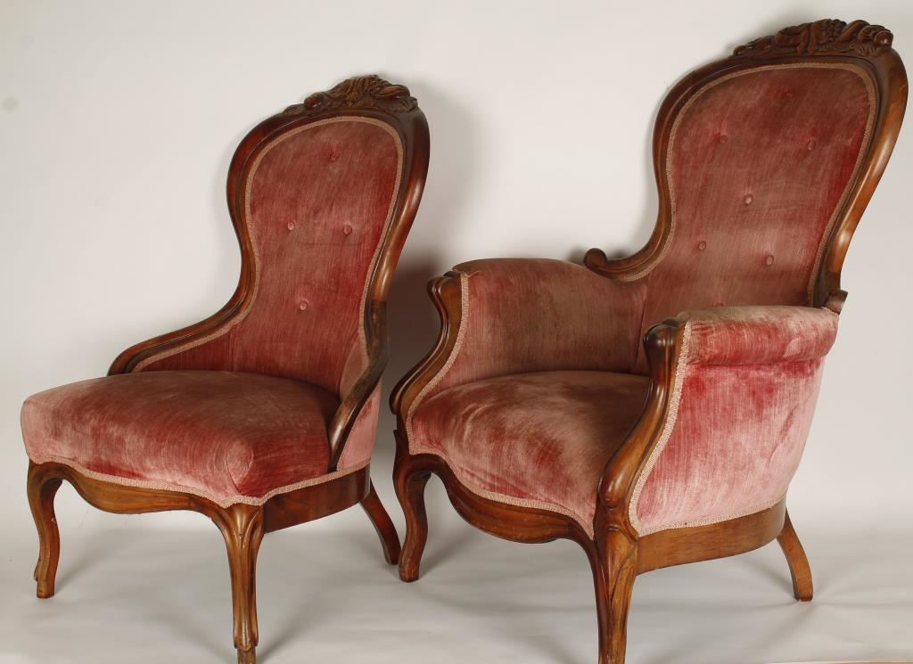 Carved walnut decoration, one of which has arms and one does not. Mauve tapestry fabric.
