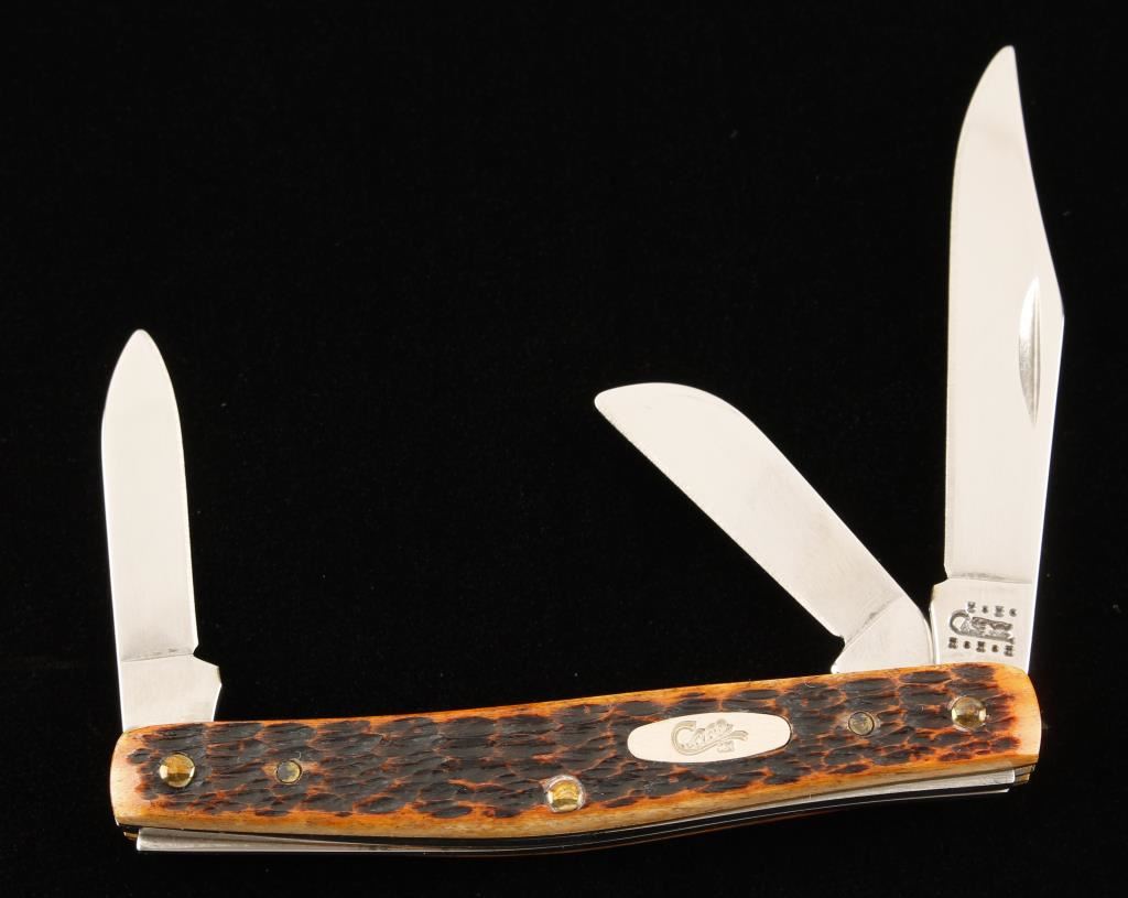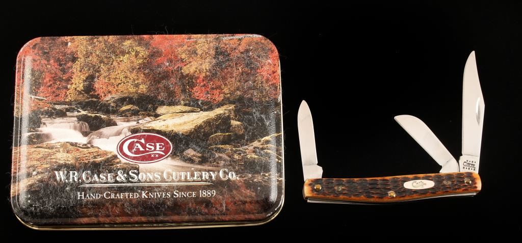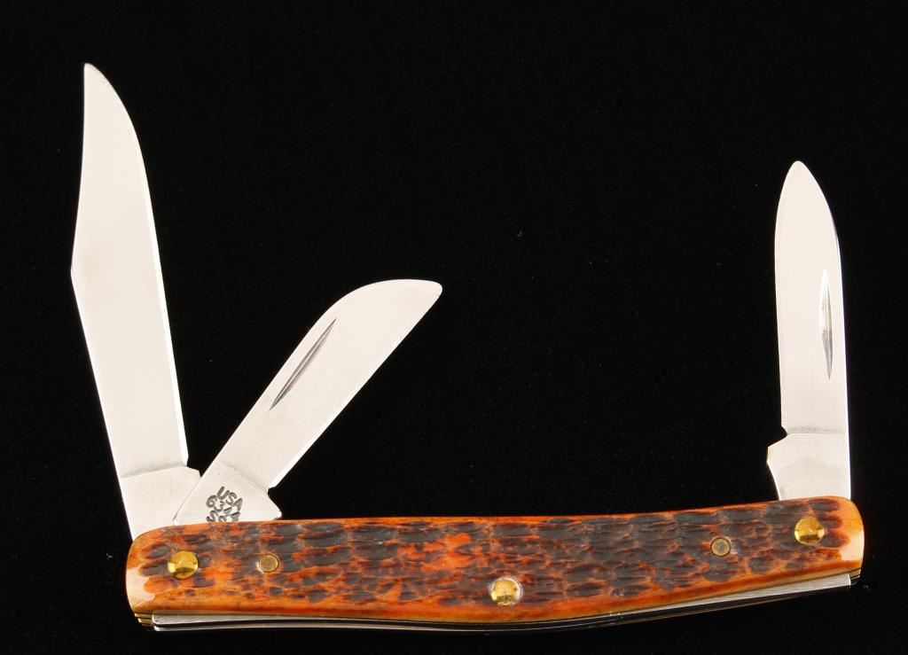 Three bladed "Small Stockman" or "Medium Stockman" in tin case. Made in 2001. Jigged bone or Delrin handles. Mint condition.