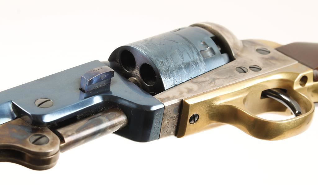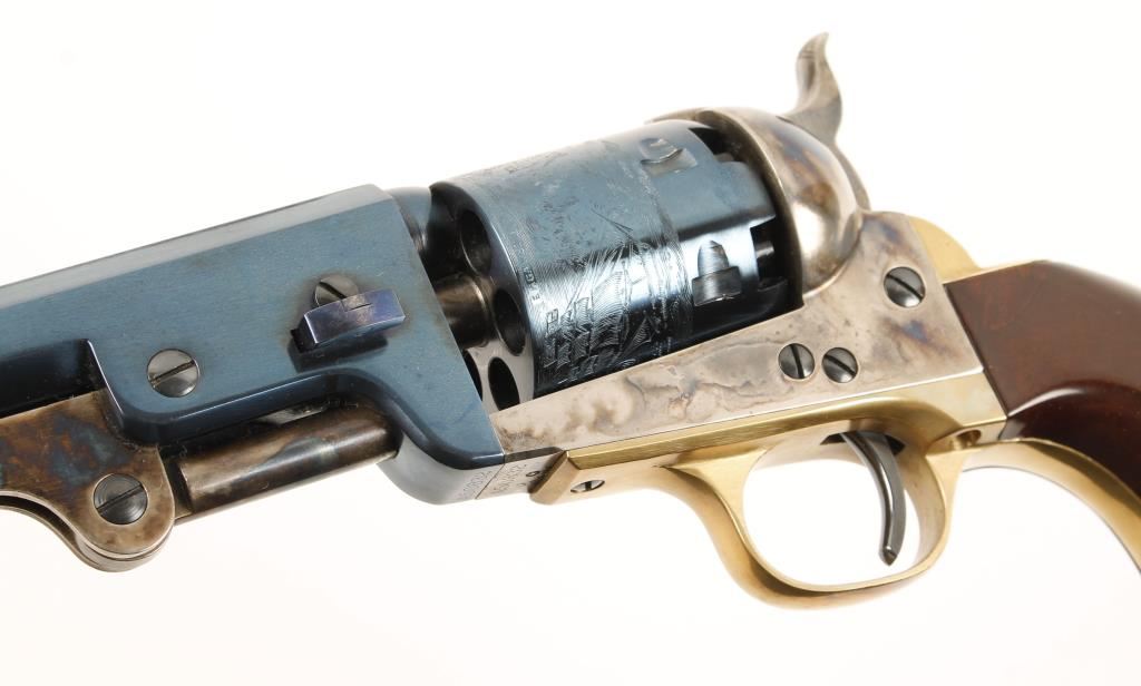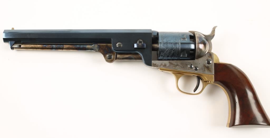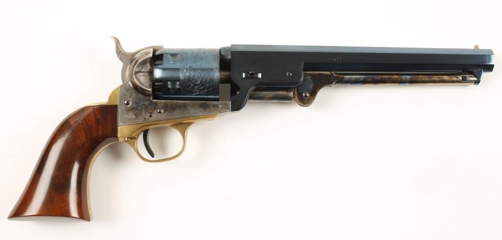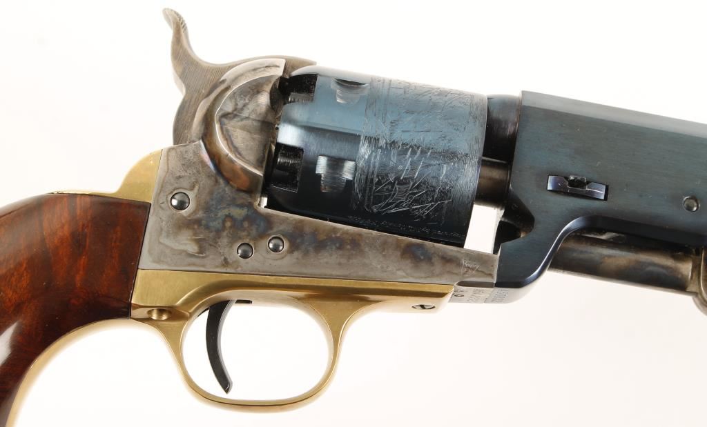 Italian made six shot single action percussion revolver chambered in .36 caliber, modeled after the Colt 1851 Navy and manufactured by Uberti. Features a charcoal blue 7.5" octagonal barrel, charcoal blue cylinder with naval scene, case hardened frame, hammer & loading lever, brass trigger guard & backstrap and one piece walnut grips. Bore is excellent and likely unfired. Condition is near fine. ***Antique Firearm***